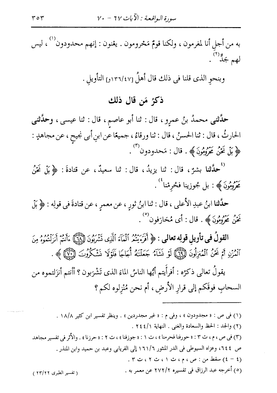 ذِكْرُ مَنْ قَالَ ذَلِكَ: حَدَّثَنِي مُحَمَّدُ بْنُ عَمْرٍو قَالَ: ثَنَا أَبُو عَاصِمٍ قَالَ: ثَنَا عِيسَى، وَحَدَّثَنِي الْحَارِثُ قَالَ: ثَنَا الْحَسَنُ قَالَ: ثَنَا وَرْقَاءُ، جَمِيعًا، عَنِ ابْنِ أَبِي نَجِيحٍ، عَنْ مُجَاهِدٍ، {§بَلْ نَحْنُ مَحْرُومُونَ} [الواقعة: 67] قَالَ: «حُورِفْنَا فَحُرِمْنَا»