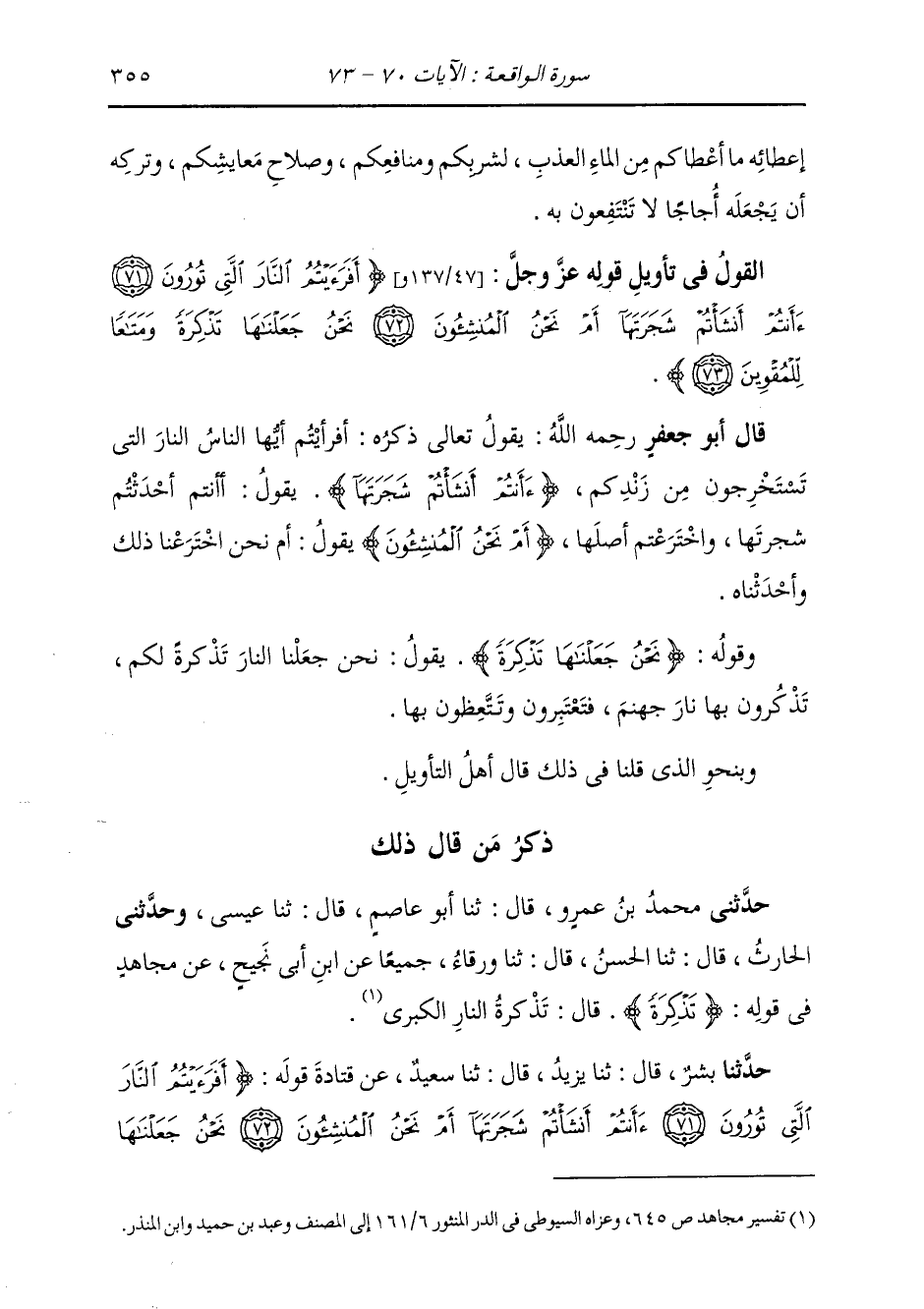 ذِكْرُ مَنْ قَالَ ذَلِكَ: حَدَّثَنِي مُحَمَّدُ بْنُ عَمْرٍو قَالَ: ثَنَا أَبُو عَاصِمٍ قَالَ: ثَنَا عِيسَى، وَحَدَّثَنِي الْحَارِثُ قَالَ: ثَنَا الْحَسَنُ قَالَ: ثَنَا وَرْقَاءُ، جَمِيعًا، عَنِ ابْنِ أَبِي نَجِيحٍ، عَنْ مُجَاهِدٍ، فِي قَوْلِهِ: {§تَذْكِرَةً} [الواقعة: 73] قَالَ: «تَذْكِرَةَ النَّارِ الْكُبْرَى»
