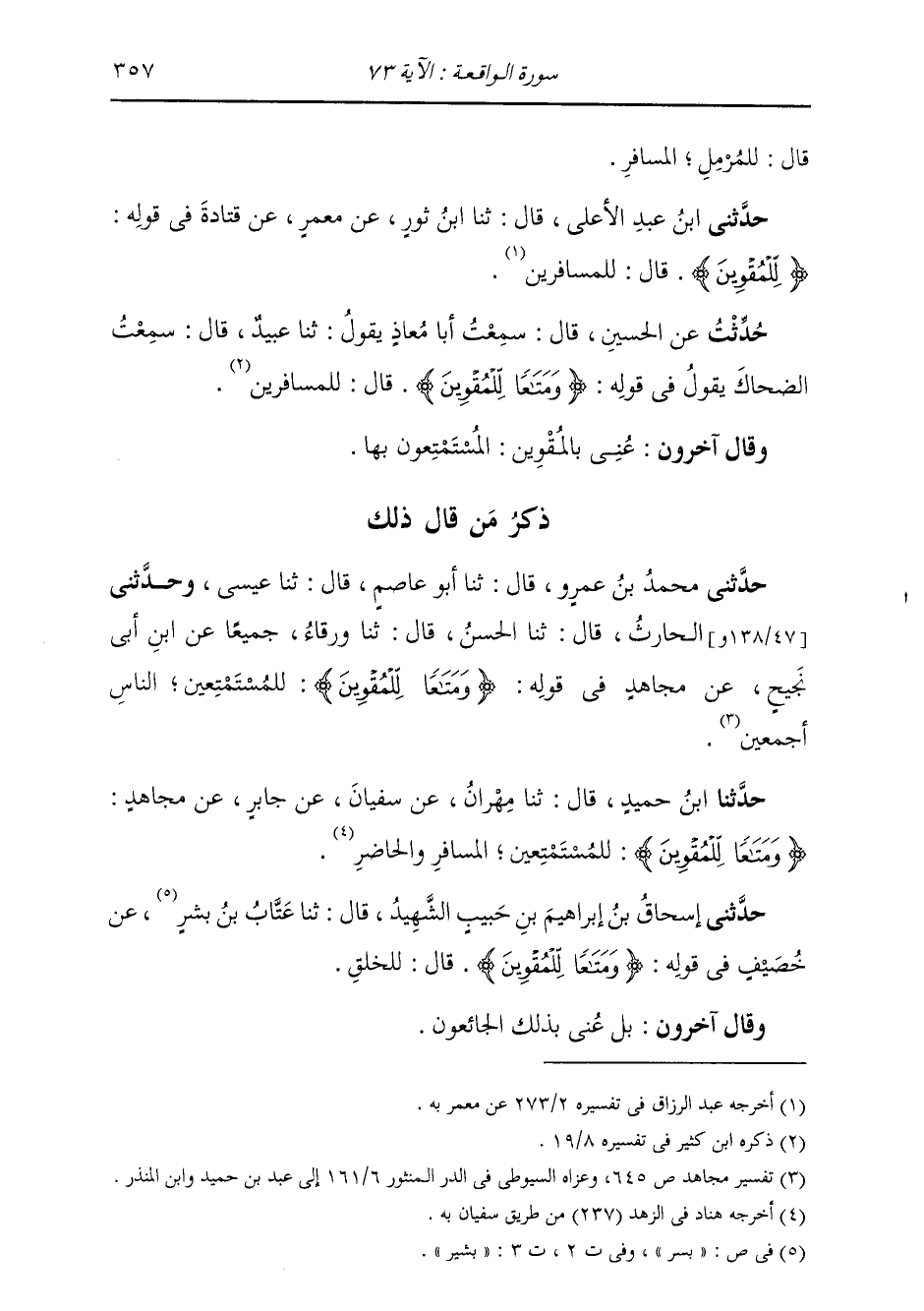 حَدَّثَنَا ابْنُ حُمَيْدٍ قَالَ: ثَنَا مِهْرَانُ، عَنْ سُفْيَانَ، عَنْ جَابِرٍ، عَنْ مُجَاهِدٍ، {§وَمَتَاعًا لِلْمُقْوِينَ} [الواقعة: 73] «لِلْمُسْتَمْتِعِينَ الْمُسَافِرِ وَالْحَاضِرِ»