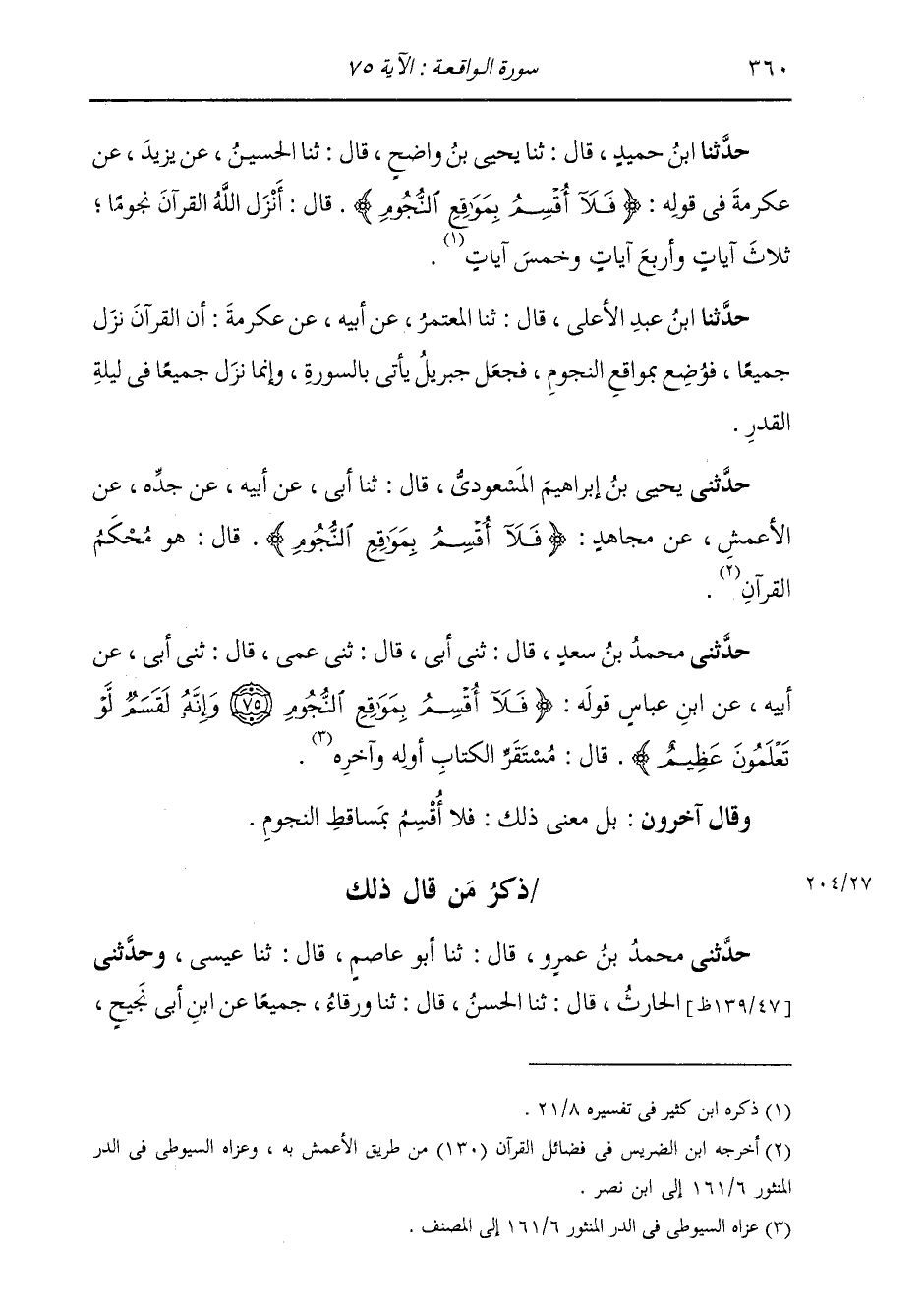 حَدَّثَنِي مُحَمَّدُ بْنُ سَعْدٍ قَالَ: ثَنِي أَبِي قَالَ: ثَنِي عَمِّي قَالَ: ثَنِي أَبِي، عَنْ أَبِيهِ، عَنِ ابْنِ عَبَّاسٍ، قَوْلَهُ: {§فَلَا أُقْسِمُ بِمَوَاقِعِ النُّجُومِ وَإِنَّهُ لَقَسَمٌ لَوْ تَعْلَمُونَ عَظِيمٌ} [الواقعة: 76] قَالَ «مُسْتَقَرُّ الْكِتَابِ أَوَّلُهُ وَآخِرُهُ» وَقَالَ آخَرُونَ: بَلْ مَعْنَى ذَلِكَ: فَلَا أُقْسِمُ بِمَسَاقِطِ النُّجُومِ