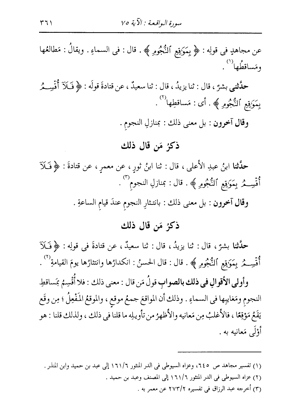 حَدَّثَنِي بِشْرٌ قَالَ: ثَنَا يَزِيدُ قَالَ: ثَنَا سَعِيدٌ، عَنْ قَتَادَةَ، قَوْلَهُ: {§فَلَا أُقْسِمُ بِمَوَاقِعِ النُّجُومِ} [الواقعة: 75] «أَيْ مَسَاقِطُهَا» وَقَالَ آخَرُونَ: بَلْ مَعْنَى ذَلِكَ: بِمَنَازِلِ النُّجُومِ