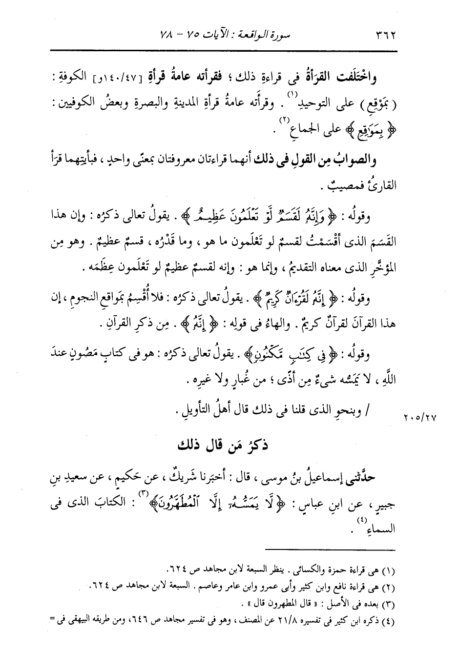 ذِكْرُ مَنْ قَالَ ذَلِكَ: حَدَّثَنِي إِسْمَاعِيلُ بْنُ مُوسَى قَالَ: أَخْبَرَنَا شَرِيكٌ، عَنْ حَكِيمٍ، عَنْ سَعِيدِ بْنِ جُبَيْرٍ، عَنِ ابْنِ عَبَّاسٍ، {§لَا يَمَسُّهُ إِلَّا الْمُطَهَّرُونَ} [الواقعة: 79] «الْكِتَابُ الَّذِي فِي السَّمَاءِ»