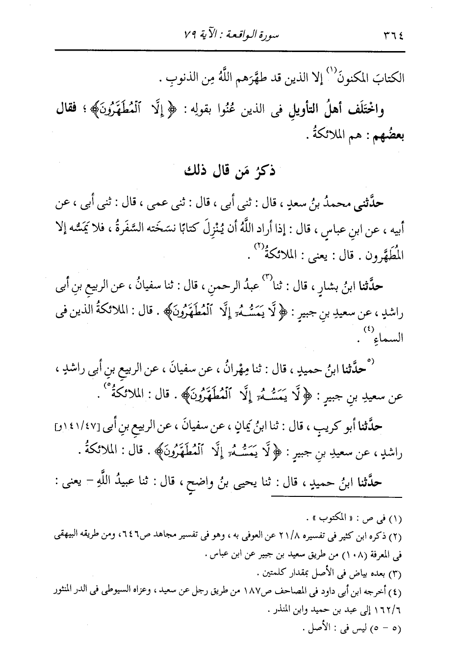 حَدَّثَنَا ابْنُ حُمَيْدٍ قَالَ: ثَنَا مِهْرَانُ، عَنْ سُفْيَانَ، عَنِ الرَّبِيعِ بْنِ أَبِي رَاشِدٍ، عَنْ سَعِيدِ بْنِ جُبَيْرٍ {§لَا يَمَسُّهُ إِلَّا الْمُطَهَّرُونَ} [الواقعة: 79] قَالَ: «الْمَلَائِكَةُ»