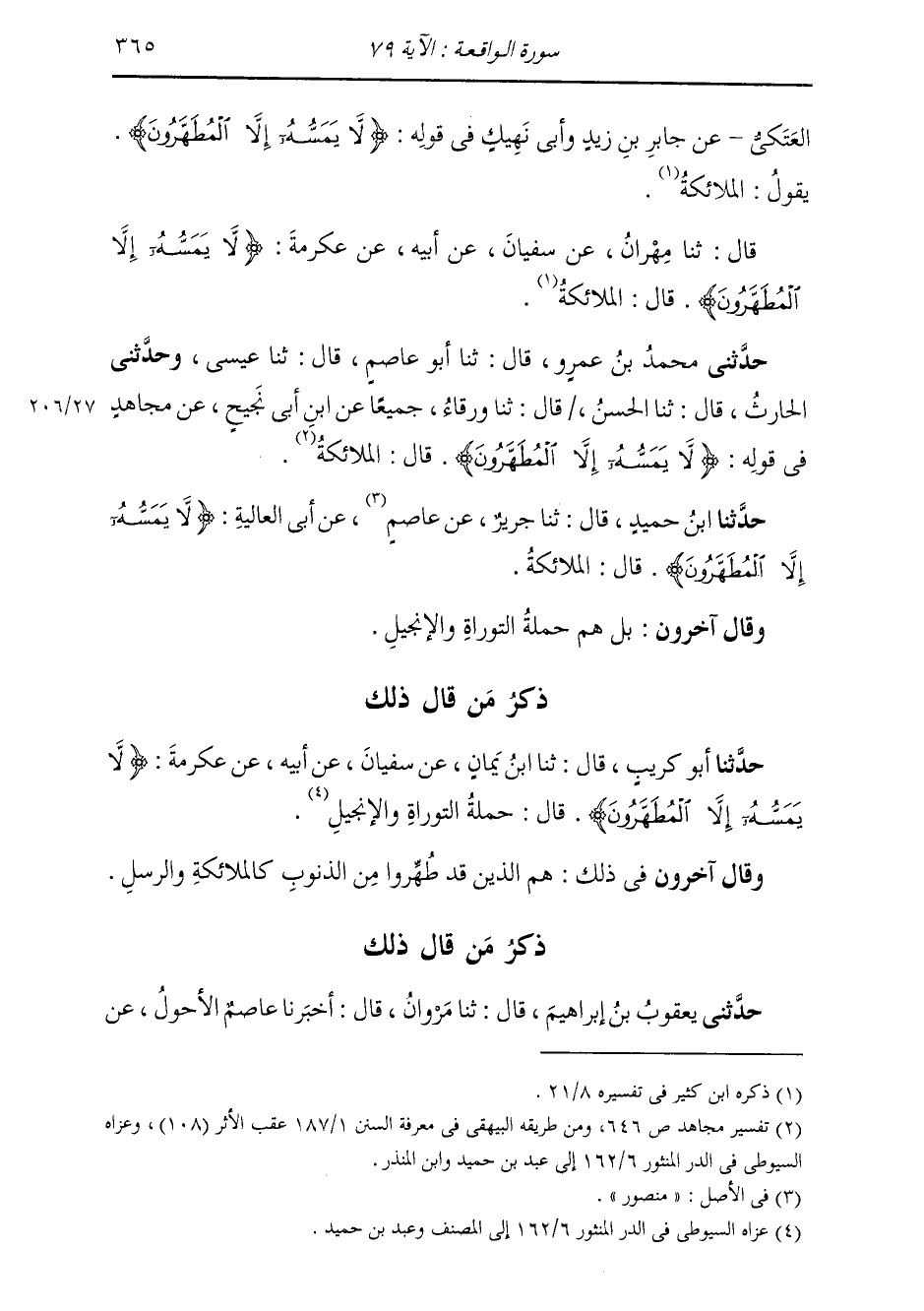 قَالَ: ثَنَا مِهْرَانُ، عَنْ سُفْيَانَ، عَنْ أَبِيهِ، عَنْ عِكْرِمَةَ، {§لَا يَمَسُّهُ إِلَّا الْمُطَهَّرُونَ} [الواقعة: 79] قَالَ: «الْمَلَائِكَةُ»