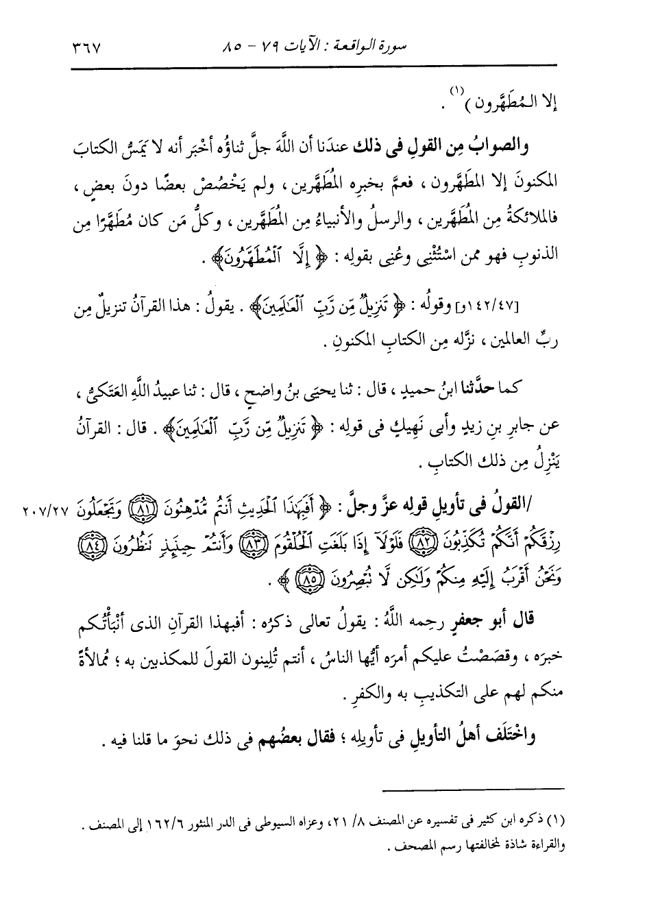 كَمَا: حَدَّثَنَا ابْنُ حُمَيْدٍ قَالَ: ثَنَا يَحْيَى بْنُ وَاضِحٍ قَالَ: ثَنَا عُبَيْدُ اللَّهِ الْعَتَكِيُّ، عَنْ جَابِرِ بْنِ زَيْدٍ، وَأَبِي نَهِيكٍ، فِي قَوْلِهِ: {§تَنْزِيلٌ مِنْ رَبِّ الْعَالَمِينَ} [الواقعة: 80] قَالَ: «الْقُرْآنُ مِنْ ذَلِكَ الْكِتَابِ»