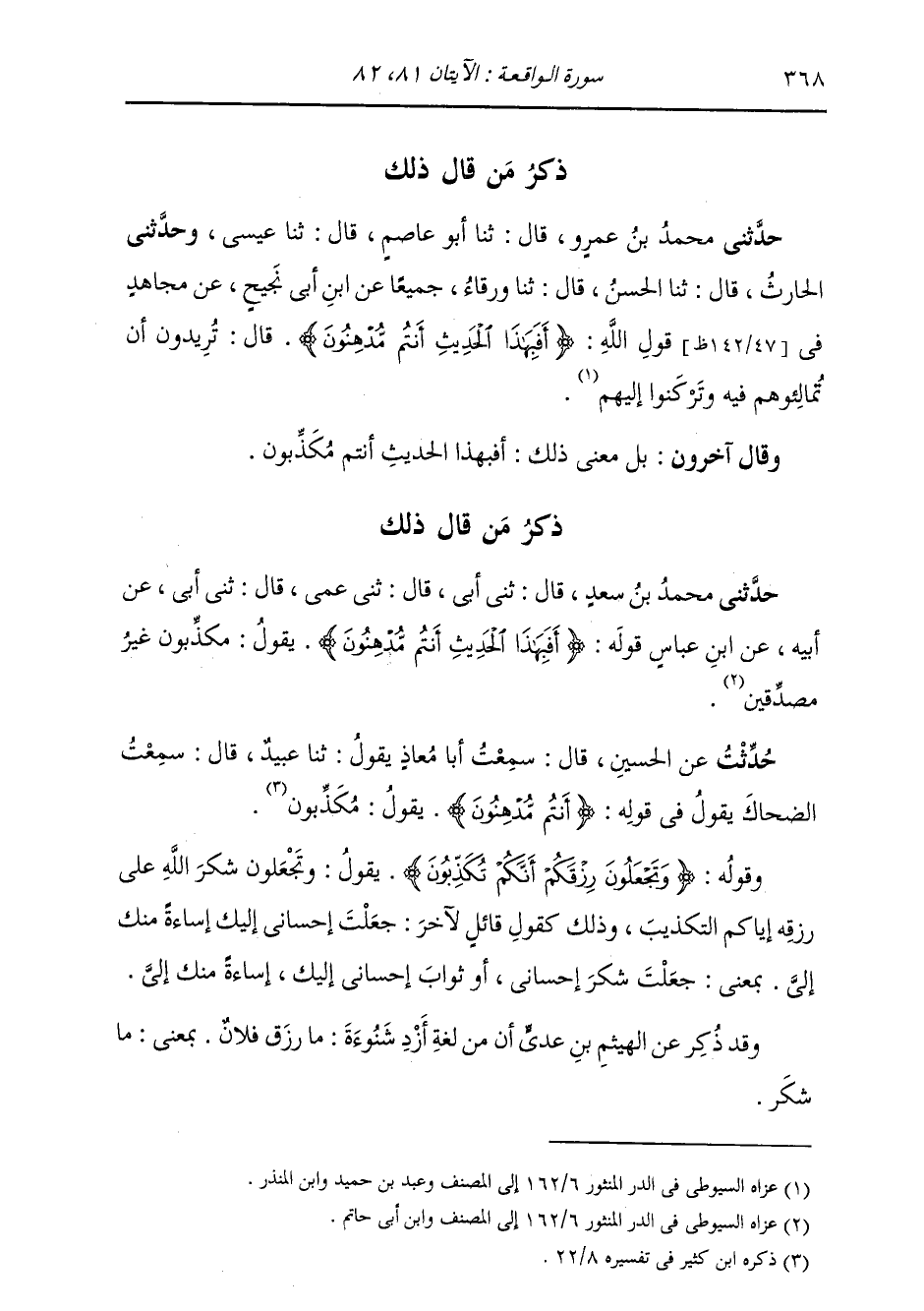 ذِكْرُ مَنْ قَالَ ذَلِكَ حَدَّثَنِي مُحَمَّدُ بْنُ سَعْدٍ قَالَ: ثَنِي أَبِي قَالَ: ثَنِي عَمِّي قَالَ: ثَنِي أَبِي، عَنْ أَبِيهِ، عَنِ ابْنِ عَبَّاسٍ، قَوْلَهُ: {§أَفَبِهَذَا الْحَدِيثِ أَنْتُمْ مُدْهِنُونَ} [الواقعة: 81] يَقُولُ: «مُكَذِّبُونَ غَيْرُ مُصَدِّقِينَ»