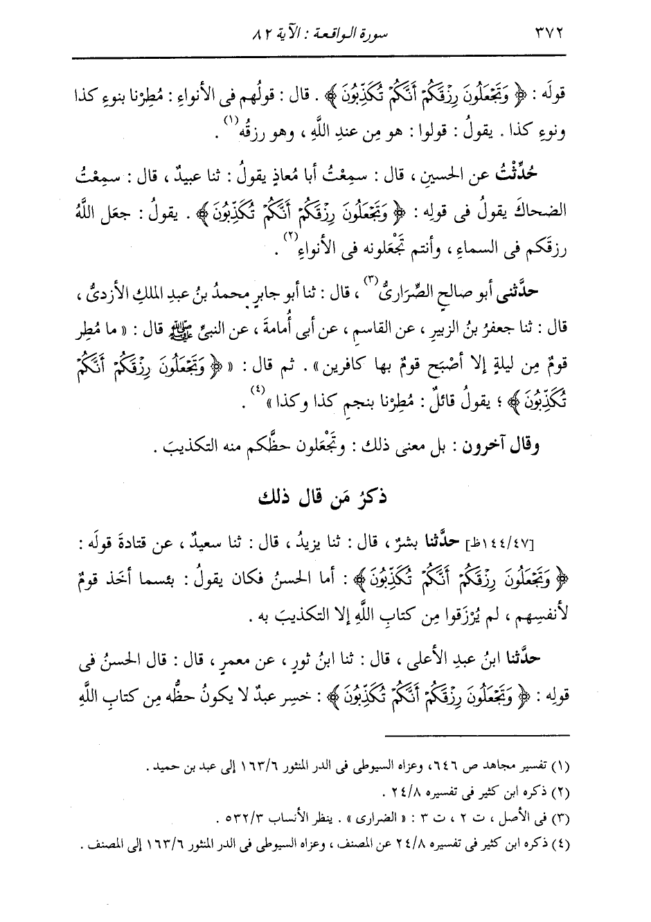 ذِكْرُ مَنْ قَالَ ذَلِكَ: حَدَّثَنَا بِشْرٌ قَالَ: ثَنَا يَزِيدُ قَالَ: ثَنَا سَعِيدٌ، عَنْ قَتَادَةَ، قَوْلَهُ: {§وَتَجْعَلُونَ رِزْقَكُمْ أَنَّكُمْ تُكَذِّبُونَ} [الواقعة: 82] أَمَا الْحَسَنُ فَكَانَ يَقُولُ: «بِئْسَمَا أَخَذَ قَوْمٌ لِأَنْفُسِهِمْ لَمْ يُرْزَقُوا مِنْ كِتَابِ اللَّهِ إِلَّا التَّكْذِيبَ بِهِ»