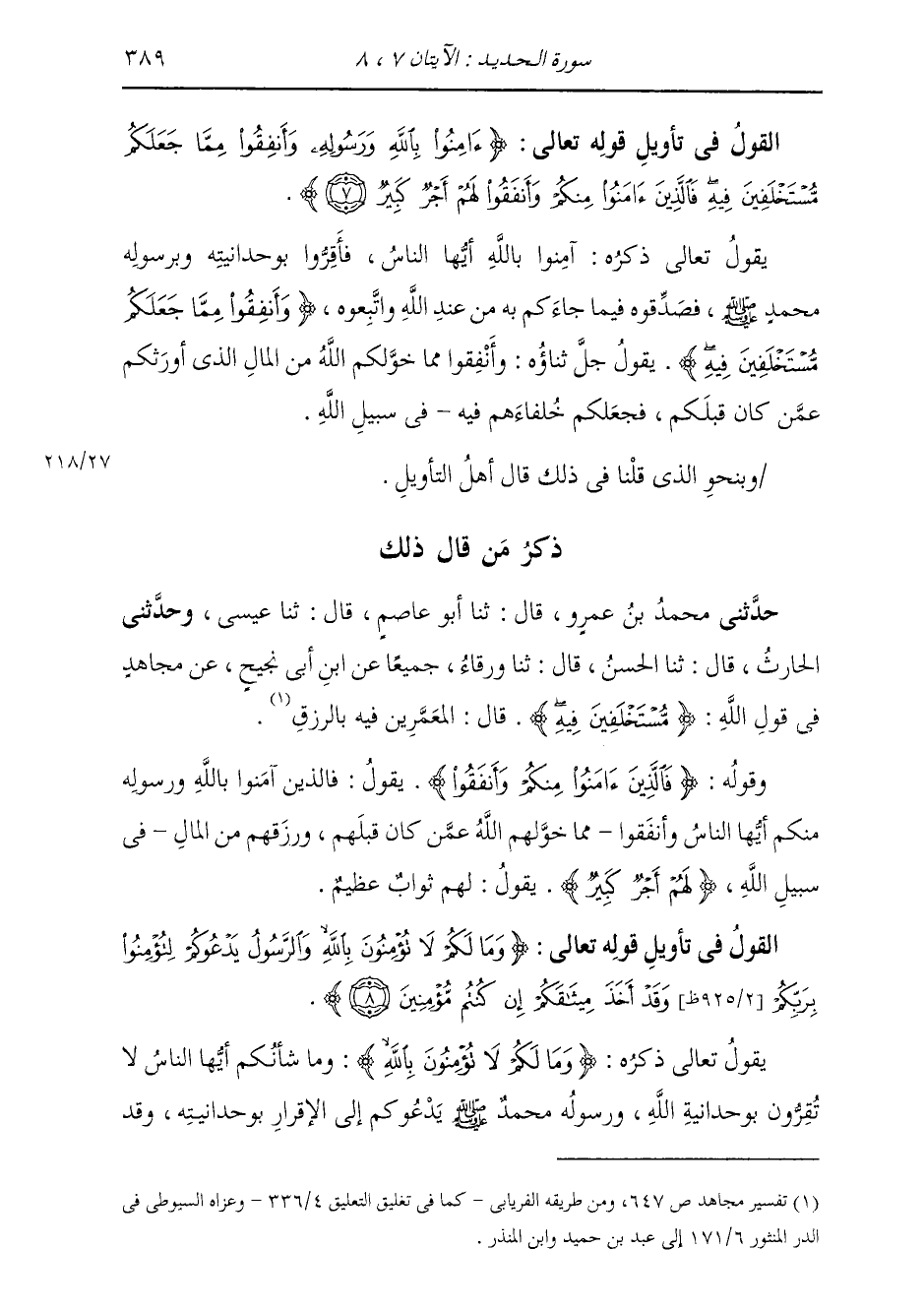 §الْقَوْلُ فِي تَأْوِيلِ قَوْلِهِ تَعَالَى: {آمِنُوا بِاللَّهِ وَرَسُولِهِ وَأَنْفِقُوا مِمَّا جَعَلَكُمْ مُسْتَخْلَفِينَ فِيهِ فَالَّذِينَ آمَنُوا مِنكُمْ وَأَنْفَقُوا لَهُمْ أَجْرٌ كَبِيرٌ} [الحديد: 7] يَقُولُ تَعَالَى ذِكْرُهُ: آمِنُوا بِاللَّهِ أَيُّهَا النَّاسُ، فَأُقِرُّوا بِوَحْدَانِيَّتِهِ وَبِرَسُولِهِ مُحَمَّدٍ صَلَّى اللهُ عَلَيْهِ وَسَلَّمَ فَصَدِّقُوهُ فِيمَا جَاءَكُمْ بِهِ مِنْ عِنْدِ اللَّهِ وَاتَّبِعُوهُ، وَأَنْفِقُوا مِمَّا جَعَلَكُمْ مُسْتَخْلَفِينَ فِيهِ، يَقُولُ جَلَّ ثَنَاؤُهُ: وَأَنْفِقُوا مِمَّا خَوَّلَكُمُ اللَّهُ مِنَ الْمَالِ الَّذِي أَوْرَثَكُمْ عَمَّنْ كَانَ قَبْلَكُمْ، فَجَعَلَكُمْ خُلَفَاءَهُمْ فِيهِ فِي سَبِيلِ اللَّهِ وَبِنَحْوِ الَّذِي قُلْنَا فِي ذَلِكَ قَالَ أَهْلُ التَّأْوِيلِ