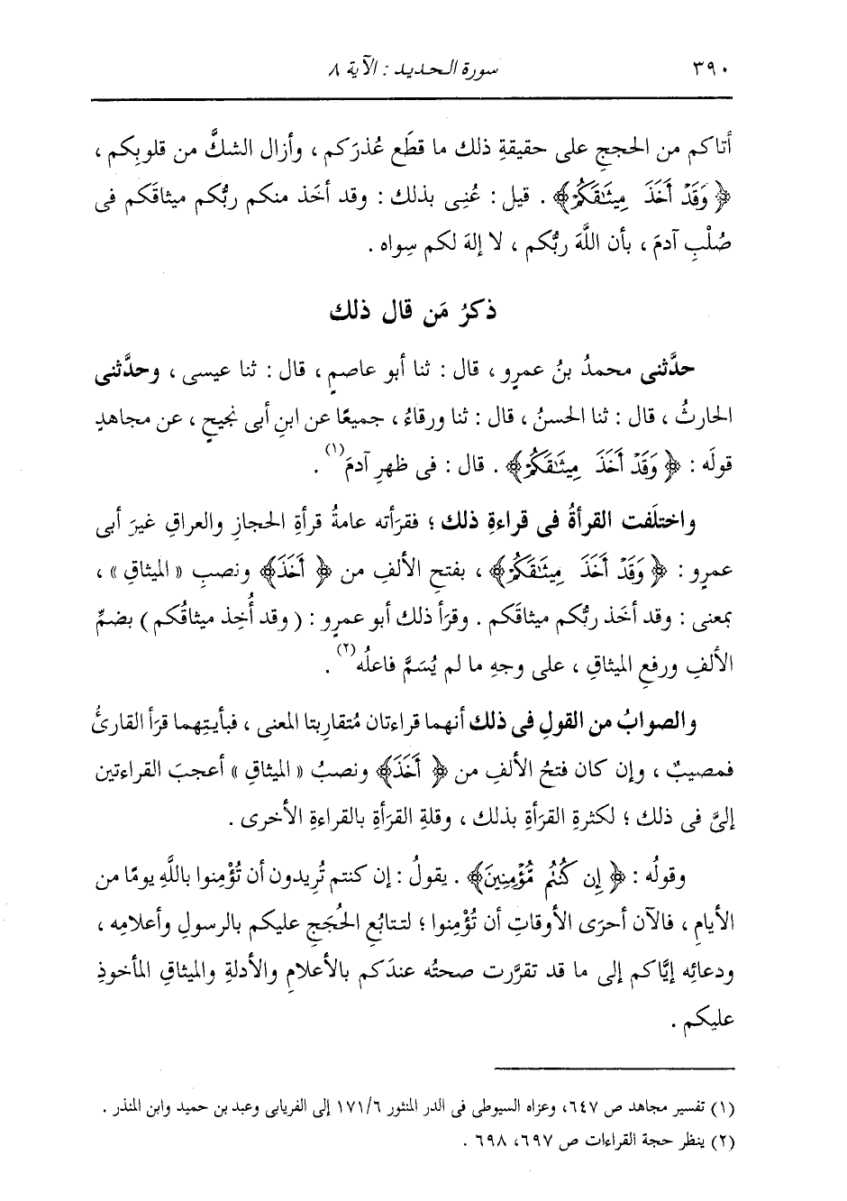 ذِكْرُ مَنْ قَالَ ذَلِكَ: حَدَّثَنِي مُحَمَّدُ بْنُ عَمْرٍو قَالَ: ثَنَا أَبُو عَاصِمٍ قَالَ: ثَنَا عِيسَى، وَحَدَّثَنِي الْحَارِثُ قَالَ: ثَنَا الْحَسَنُ قَالَ: ثَنَا وَرْقَاءُ، جَمِيعًا، عَنِ ابْنِ أَبِي نَجِيحٍ، عَنْ مُجَاهِدٍ، قَوْلَهُ: {§وَقَدْ أَخَذَ مِيثَاقَكُمْ} [الحديد: 8] قَالَ: «فِي ظَهْرِ آدَمَ» وَاخْتَلَفَتِ الْقُرَّاءُ فِي قِرَاءَةِ ذَلِكَ، فَقَرَأَتْهُ عَامَّةُ قُرَّاءِ الْحِجَازِ وَالْعِرَاقِ غَيْرَ أَبِي عَمْرٍو {وَقَدْ أَخَذَ مِيثَاقَكُمْ} [الحديد: 8] بِفَتْحِ الْأَلِفِ مِنْ أَخَذَ وَنَصْبِ الْمِيثَاقِ، بِمَعْنَى: وَقَدْ أَخَذَ رَبُّكُمْ مِيثَاقَكُمْ وَقَرَأَ ذَلِكَ أَبُو عَمْرٍو: (وَقَدْ أُخِذَ مِيثَاقُكُمْ) بِضَمِّ الْأَلِفِ وَرَفْعِ الْمِيثَاقِ، عَلَى وَجْهِ مَا لَمْ يُسَمَّ فَاعِلُهُ وَالصَّوَابُ مِنَ الْقَوْلِ فِي ذَلِكَ أَنَّهُمَا قِرَاءَتَانِ مُتَقَارِبَتَا الْمَعْنَى، فَبِأَيَّتِهِمَا قَرَأَ الْقَارِئُ فَمُصِيبٌ، وَإِنْ كَانَ فَتْحُ الْأَلِفِ مِنْ أَخَذَ وَنَصْبُ الْمِيثَاقِ أَعْجَبُ الْقِرَاءَتَيْنِ إِلَيَّ فِي ذَلِكَ لِكَثْرَةِ الْقِرَاءَةِ بِذَلِكَ، وَقِلَّةِ الْقُرَّاءِ بِالْقِرَاءَةِ الْأُخْرَى
