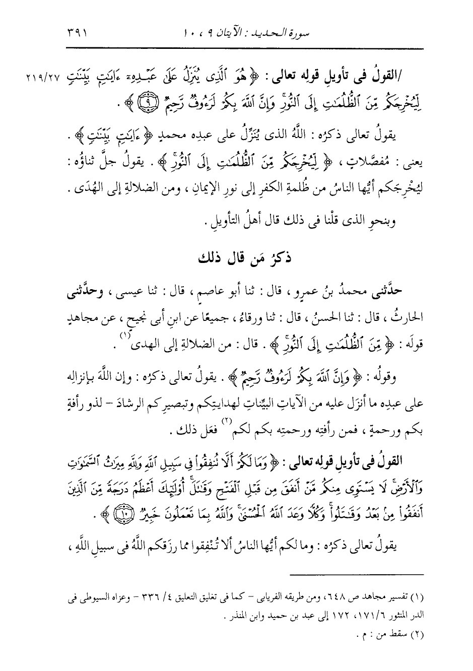 ذِكْرُ مَنْ قَالَ ذَلِكَ: حَدَّثَنِي مُحَمَّدُ بْنُ عَمْرٍو قَالَ: ثَنَا أَبُو عَاصِمٍ قَالَ: ثَنَا عِيسَى، وَحَدَّثَنِي الْحَارِثُ قَالَ: ثَنَا الْحَسَنُ قَالَ: ثَنَا وَرْقَاءُ، جَمِيعًا، عَنِ ابْنِ أَبِي نَجِيحٍ، عَنْ مُجَاهِدٍ، قَوْلَهُ: {§مِنَ الظُّلُمَاتِ إِلَى النُّورِ} [الحديد: 9] قَالَ: «مِنَ الضَّلَالَةِ إِلَى الْهُدَى»