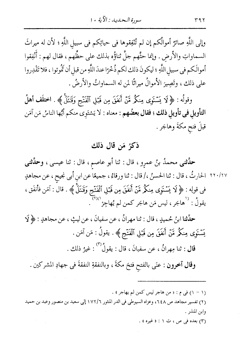 ذِكْرُ مَنْ قَالَ ذَلِكَ: حَدَّثَنِي مُحَمَّدُ بْنُ عَمْرٍو قَالَ: ثَنَا أَبُو عَاصِمٍ قَالَ: ثَنَا عِيسَى، وَحَدَّثَنِي الْحَارِثُ قَالَ: ثَنَا الْحَسَنُ قَالَ: ثَنَا وَرْقَاءُ، جَمِيعًا، عَنِ ابْنِ أَبِي نَجِيحٍ، عَنْ مُجَاهِدٍ، فِي قَوْلِهِ: {§لَا يَسْتَوِي مِنْكُمْ مَنْ أَنْفَقَ مِنْ قَبْلِ الْفَتْحِ وَقَاتَلَ} [الحديد: 10] قَالَ: " آمَنَ فَأَنْفَقَ، يَقُولُ: مَنْ هَاجَرَ لَيْسَ كَمَنْ لَمْ يُهَاجِرْ "