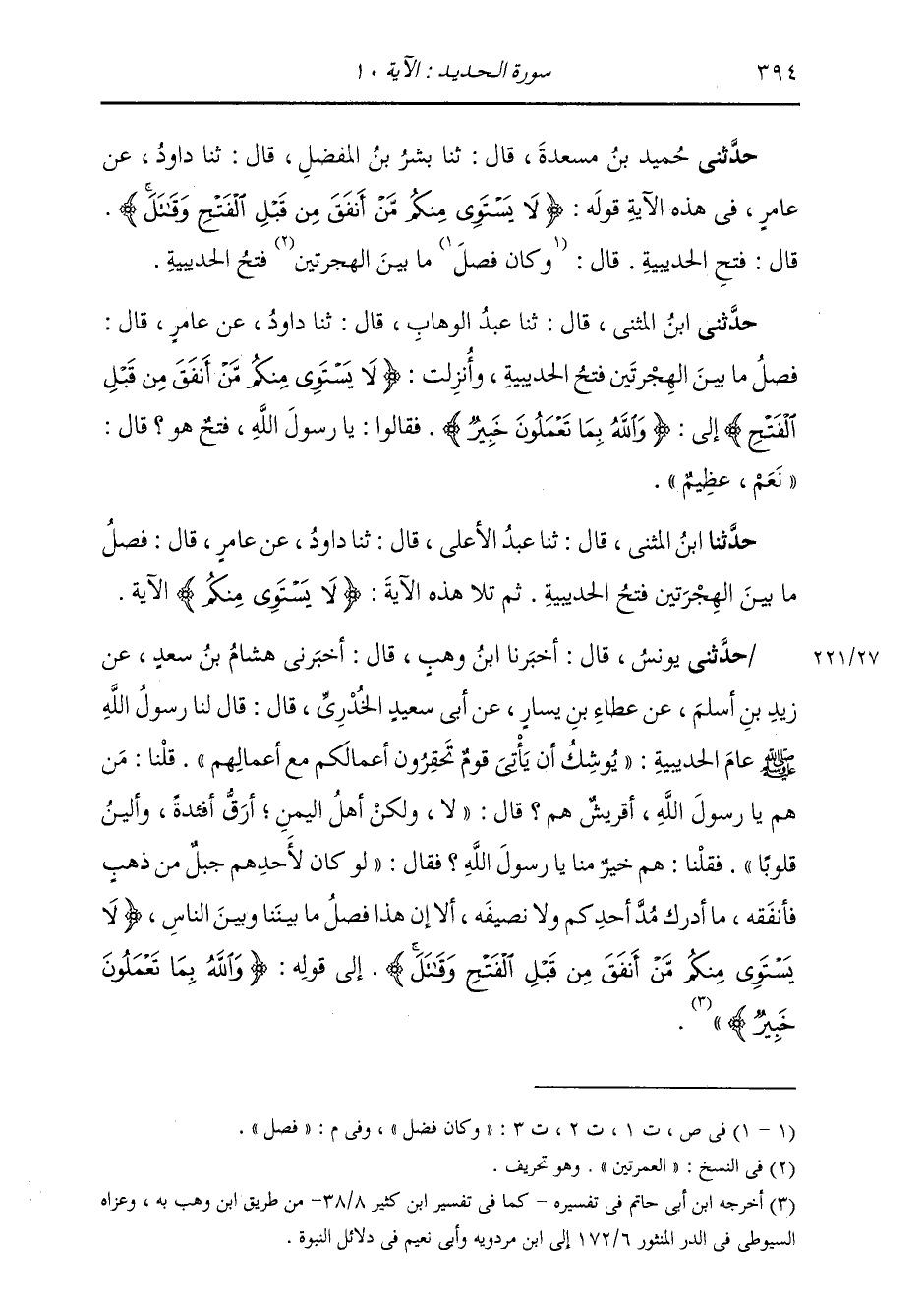 حَدَّثَنِي حُمَيْدُ بْنُ مَسْعَدَةَ قَالَ: ثَنَا بِشْرُ بْنُ الْمُفَضَّلِ قَالَ: ثَنَا دَاوُدُ، عَنْ عَامِرٍ، فِي هَذِهِ الْآيَةِ، قَوْلِهِ: {§لَا يَسْتَوِي مِنْكُمْ مَنْ أَنْفَقَ مِنْ قَبْلِ الْفَتْحِ وَقَاتَلَ} [الحديد: 10] قَالَ: «فَتْحِ الْحُدَيْبِيَةِ» قَالَ: «فَصْلُ مَا بَيْنَ الْعُمْرَتَيْنِ فَتْحُ الْحُدَيْبِيَةِ»