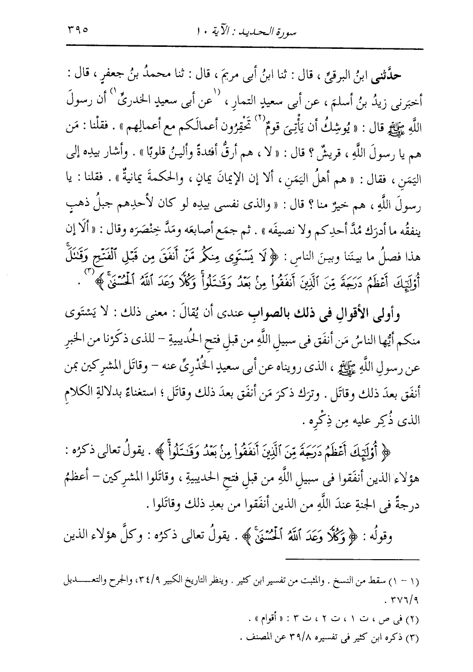 حَدَّثَنِي ابْنُ الْبَرْقِيِّ قَالَ: ثَنَا ابْنُ أَبِي مَرْيَمَ قَالَ: ثَنَا مُحَمَّدُ بْنُ جَعْفَرٍ قَالَ: أَخْبَرَنِي زَيْدُ بْنُ أَسْلَمَ، عَنْ أَبِي سَعِيدٍ التَّمَّارِ، أَنَّ رَسُولَ اللَّهِ صَلَّى اللهُ عَلَيْهِ وَسَلَّمَ قَالَ: «§يُوشِكُ أَنْ يَأْتِيَ قَوْمٌ تَحْقِرُونَ أَعْمَالَكُمْ مَعَ أَعْمَالِهِمْ» ، فَقُلْنَا: مَنْ هُمْ يَا رَسُولَ اللَّهِ، أَقُرَيْشٌ؟ قَالَ: «لَا، هُمْ أَرَقُّ أَفْئِدَةً وَأَلْيَنُ قُلُوبًا» ، وَأَشَارَ بِيَدِهِ إِلَى الْيَمَنِ، فَقَالَ: «هُمْ أَهْلُ الْيَمَنِ، أَلَا إِنَّ الْإِيمَانَ يَمَانِ، وَالْحِكْمَةُ يَمَانِيَةٌ» فَقُلْنَا: يَا رَسُولَ اللَّهِ هُمْ خَيْرٌ مِنَّا؟ قَالَ: «وَالَّذِي نَفْسِي بِيَدِهِ لَوْ كَانَ لِأَحَدِكُمْ جَبَلُ ذَهَبٍ يُنْفِقُهُ مَا أَدْرَكَ مُدَّ أَحَدِكُمْ وَلَا نَصِيفَهُ» ، ثُمَّ جَمَعَ أَصَابِعَهُ، وَمَدَّ خِنْصَرَهُ وَقَالَ: " أَلَا إِنَّ هَذَا فَصْلُ مَا بَيْنَنَا وَبَيْنَ النَّاسِ {لَا يَسْتَوِي مِنْكُمْ مَنْ أَنْفَقَ مِنْ قَبْلِ الْفَتْحِ وَقَاتَلَ أُولَئِكَ أَعْظَمُ دَرَجَةً مِنَ الَّذِينَ أَنْفَقُوا مِنْ بَعْدُ وَقَاتَلُوا وَكُلًّا وَعَدَ اللَّهُ الْحُسْنَى} [الحديد: 10] " وَأَوْلَى الْأَقْوَالِ فِي ذَلِكَ بِالصَّوَابِ عِنْدِي أَنْ يُقَالَ: مَعْنَى ذَلِكَ لَا يَسْتَوِي مِنْكُمْ أَيُّهَا النَّاسُ مَنْ أَنْفَقَ فِي سَبِيلِ اللَّهِ مِنْ قَبْلِ فَتْحِ الْحُدَيْبِيَةِ لِلَّذِي ذَكَرْنَا مِنَ الْخَبَرِ عَنْ رَسُولِ اللَّهِ صَلَّى اللهُ عَلَيْهِ وَسَلَّمَ، الَّذِي رُوِّينَاهُ عَنْ أَبِي سَعِيدٍ الْخُدْرِيِّ عَنْهُ وَقَاتَلَ الْمُشْرِكِينَ بِمَنْ أَنْفَقَ بَعْدَ ذَلِكَ، وَقَاتَلَ وَتَرَكَ ذِكْرَ مَنْ أَنْفَقَ بَعْدَ ذَلِكَ، وَقَاتَلَ اسْتِغْنَاءً بِدِلَالَةِ الْكَلَامِ الَّذِي ذُكِرَ عَلَيْهِ مِنْ ذِكْرِهِ {أُولَئِكَ أَعْظَمُ دَرَجَةً مِنَ الَّذِينَ أَنْفَقُوا مِنْ بَعْدُ وَقَاتَلُوا} [الحديد: 10] يَقُولُ تَعَالَى ذِكْرُهُ: هَؤُلَاءِ الَّذِينَ أَنْفَقُوا فِي سَبِيلِ اللَّهِ مِنْ قَبْلِ فَتْحِ الْحُدَيْبِيَةِ، وَقَاتَلُوا الْمُشْرِكِينَ أَعْظَمُ دَرَجَةً فِي الْجَنَّةِ عِنْدَ اللَّهِ مِنَ الَّذِينَ أَنْفَقُوا مِنْ بَعْدِ ذَلِكَ وَقَاتَلُوا