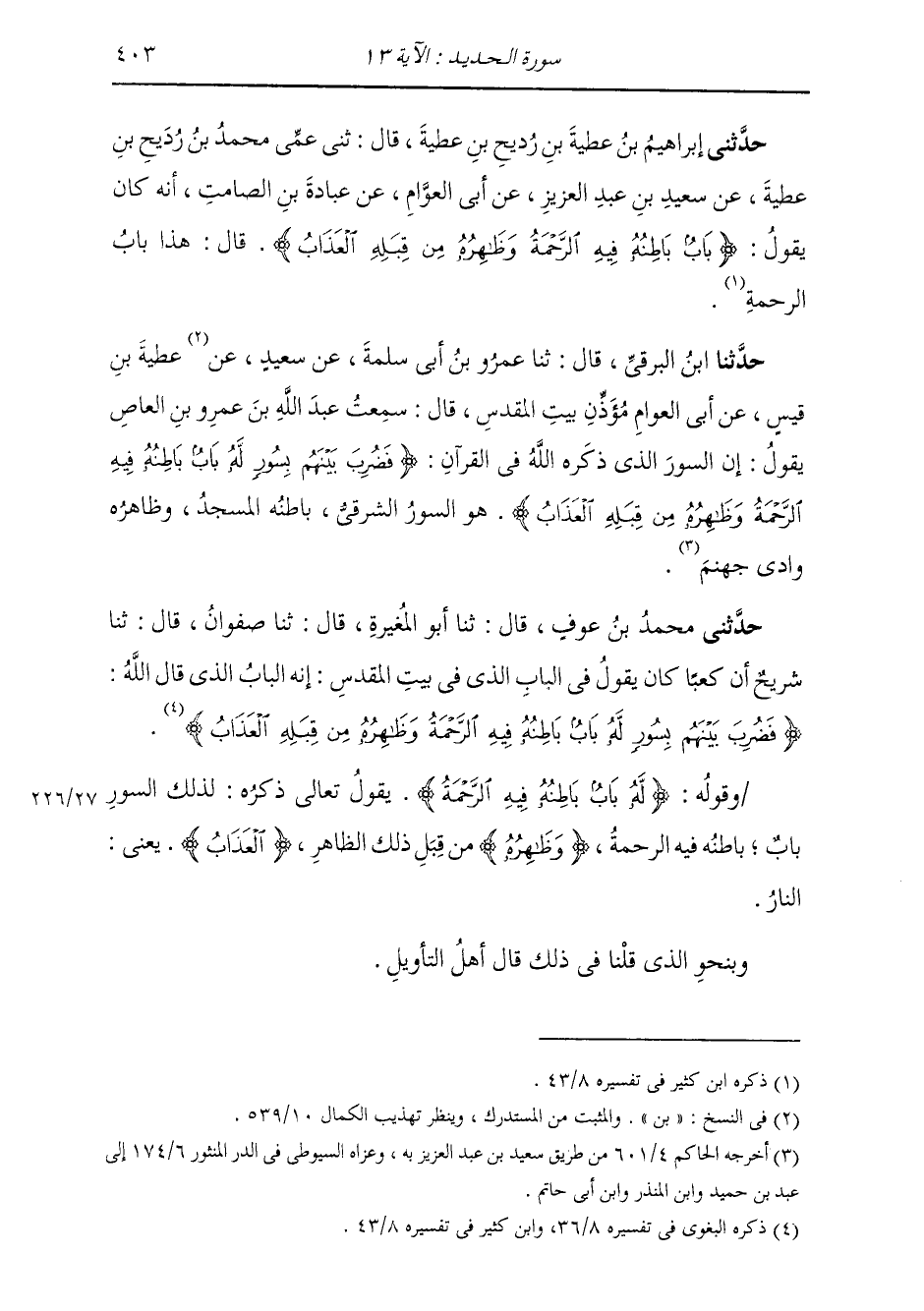 حَدَّثَنَا ابْنُ الْبَرْقِيِّ قَالَ: ثَنَا عَمْرُو بْنُ أَبِي سَلَمَةَ، عَنْ سَعِيدِ بْنِ عَطِيَّةَ بْنِ قَيْسٍ، عَنْ أَبِي الْعَوَّامِ، مُؤَذِّنِ بَيْتِ الْمَقْدِسِ قَالَ: سَمِعْتُ عَبْدَ اللَّهِ بْنَ عَمْرِو بْنِ الْعَاصِ، يَقُولُ: «إِنَّ §السُّورَ الَّذِي ذَكَرَهُ اللَّهُ فِي الْقُرْآنِ» : {فَضُرِبَ بَيْنَهُمْ بِسُورٍ لَهُ بَابٌ بَاطِنُهُ فِيهِ الرَّحْمَةُ وَظَاهِرُهُ مِنْ قِبَلِهِ الْعَذَابُ} [الحديد: 13] «هُوَ السُّورُ الشَّرْقِيُّ، بَاطِنُهُ الْمَسْجِدُ، وَظَاهِرُهُ وَادِي جَهَنَّمَ»