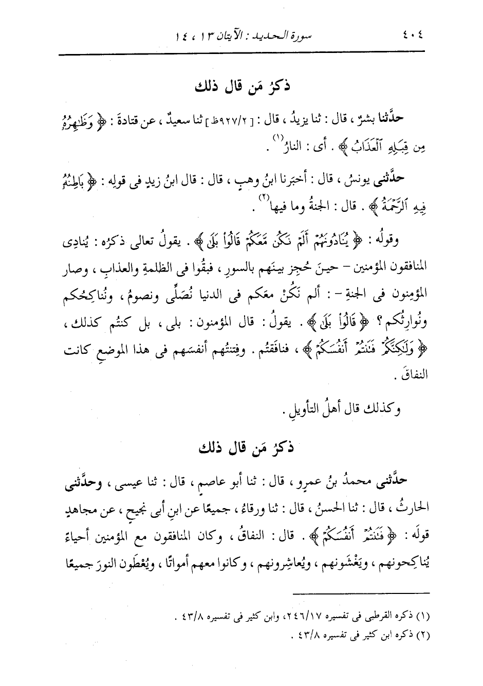 ذِكْرُ مَنْ قَالَ ذَلِكَ: حَدَّثَنِي مُحَمَّدُ بْنُ عَمْرٍو قَالَ: ثَنَا أَبُو عَاصِمٍ قَالَ: ثَنَا عِيسَى، وَحَدَّثَنِي الْحَارِثُ قَالَ: ثَنَا الْحَسَنُ قَالَ: ثَنَا وَرْقَاءُ، جَمِيعًا، عَنِ ابْنِ أَبِي نَجِيحٍ، عَنْ مُجَاهِدٍ، قَوْلَهُ: {§فَتَنْتُمْ أَنْفُسَكُمْ} [الحديد: 14] قَالَ: «النِّفَاقُ، وَكَانَ الْمُنَافِقُونَ مَعَ الْمُؤْمِنِينَ أَحْيَاءً يُنَاكِحُونَهُمْ، وَيَغْشَوْنَهُمْ، وَيُعَاشِرُونَهُمْ، وَكَانُوا مَعَهُمْ أَمْوَاتًا، وَيُعْطَوْنَ النُّورَ جَمِيعًا -[405]- يَوْمَ الْقِيَامَةِ، فَيُطْفَأُ النُّورُ مِنَ الْمُنَافِقِينَ إِذَا بَلَغُوا السُّورَ، وَيُمَازُ بَيْنَهُمْ حِينَئِذٍ»