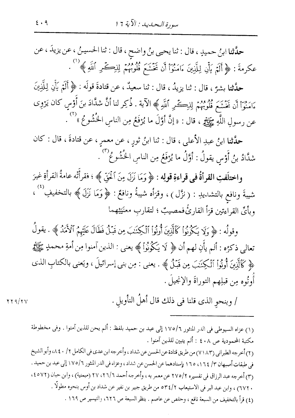 حَدَّثَنَا ابْنُ عَبْدِ الْأَعْلَى قَالَ: ثَنَا ابْنُ ثَوْرٍ، عَنْ مَعْمَرٍ، عَنْ قَتَادَةَ قَالَ: كَانَ شَدَّادُ بْنُ أَوْسٍ يَقُولُ: «§أَوَّلُ مَا يُرْفَعُ مِنَ النَّاسِ الْخُشُوعُ» وَاخْتَلَفَتِ الْقُرَّاءُ فِي قِرَاءَةِ قَوْلِهِ: {وَمَا نَزَلَ مِنَ الْحَقِّ} [الحديد: 16] فَقَرَأَتْهُ عَامَّةُ الْقُرَّاءِ غَيْرَ شَيْبَةَ وَنَافِعٍ بِالتَّشْدِيدِ (نَزَّلَ) ، وَقَرَأَهُ شَيْبَةُ وَنَافِعٌ، {وَمَا نَزَلَ} [الحديد: 16] بِالتَّخْفِيفِ، وَبِأَيِّ الْقِرَاءَتَيْنِ قَرَأَ الْقَارِئُ فَمُصِيبٌ، لِتَقَارُبِ مَعْنَيَيْهِمَا