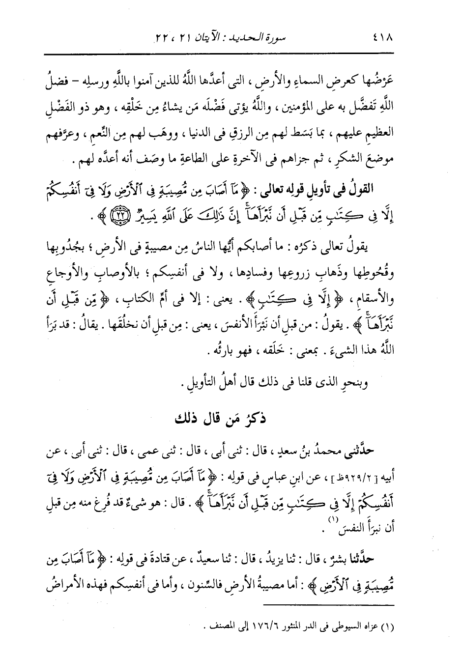 §الْقَوْلُ فِي تَأْوِيلِ قَوْلِهِ تَعَالَى: {مَا أَصَابَ مِنْ مُصِيبَةٍ فِي الْأَرْضِ وَلَا فِي أَنْفُسِكُمْ إِلَّا فِي كِتَابٍ مِنْ قَبْلِ أَنْ نَبْرَأَهَا إِنَّ ذَلِكَ عَلَى اللَّهِ يَسِيرٌ} [الحديد: 22] يَقُولُ تَعَالَى ذِكْرُهُ: مَا أَصَابَكُمْ أَيُّهَا النَّاسُ مِنْ مُصِيبَةٍ فِي الْأَرْضِ بِجُدُوبِهَا وَقُحُوطِهَا وَذَهَابِ زَرْعِهَا وَفَسَادِهَا {وَلَا فِي أَنْفُسِكُمْ} [الحديد: 22] بِالْأَوْصَابِ وَالْأَوْجَاعِ وَالْأَسْقَامِ {إِلَّا فِي كِتَابٍ} [الأنعام: 59] يَعْنِي إِلَّا فِي أُمِّ الْكِتَابِ {مِنْ قَبْلِ أَنْ نَبْرَأَهَا} [الحديد: 22] يَقُولُ: مِنْ قَبْلِ أَنْ نَبْرَأَ الْأَنْفُسَ، يَعْنِي مِنْ قَبْلِ أَنْ نَخْلُقَهَا يُقَالُ: قَدْ بَرَأَ اللَّهُ هَذَا الشَّيْءَ، بِمَعْنَى: خَلَقَهُ فَهُوَ بَارِئُهُ وَبِنَحْوِ الَّذِي قُلْنَا فِي ذَلِكَ قَالَ أَهْلُ التَّأْوِيلِ