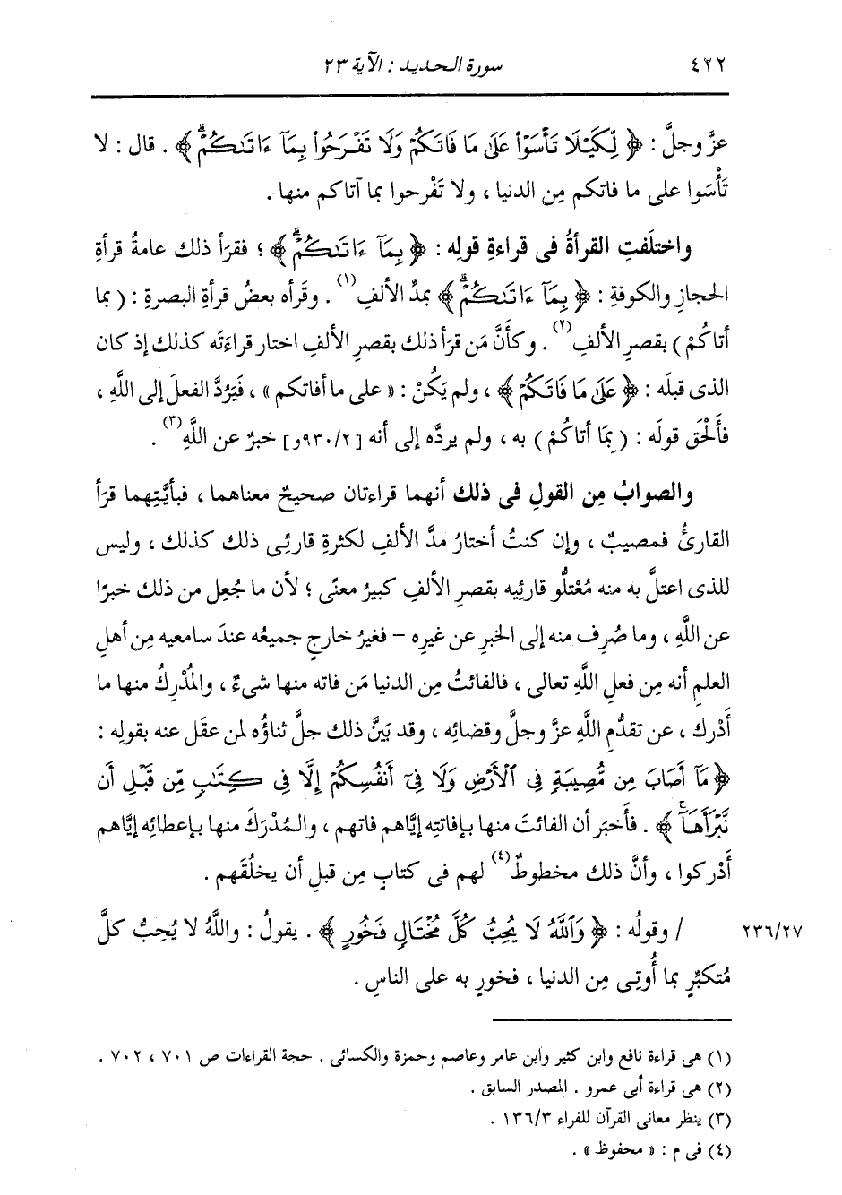 عَزَّ وَجَلَّ: {§لِكَيْلَا تَأْسَوْا عَلَى مَا فَاتَكُمْ وَلَا تَفْرَحُوا بِمَا آتَاكُمْ} [الحديد: 23] قَالَ: «لَا تَأْسَوْا عَلَى مَا فَاتَكُمْ مِنَ الدُّنْيَا، وَلَا تَفْرَحُوا بِمَا آتَاكُمْ مِنْهَا» وَاخْتَلَفَتِ الْقُرَّاءُ فِي قِرَاءَةِ قَوْلِهِ: {بمَا آتَاكُمْ} [الحديد: 23] فَقَرَأَ ذَلِكَ عَامَّةُ قُرَّاءِ الْحِجَازِ وَالْكُوفَةِ {بِمَا آتَاكُمْ} [الحديد: 23] بِمَدِّ الْأَلِفِ وَقَرَأَهُ بَعْضُ قُرَّاءِ الْبَصْرَةِ (بِمَا أَتَاكُمْ) بِقَصْرِ الْأَلِفِ؛ وَكَأَنَّ مَنْ قَرَأَ ذَلِكَ بِقَصْرِ الْأَلِفِ اخْتَارَ قِرَاءَتَهُ كَذَلِكَ، إِذْ كَانَ الَّذِي قَبْلَهُ عَلَى مَا فَاتَكُمْ، وَلَمْ يَكُنْ عَلَى مَا أَفَاتَكُمْ، فَيُرَدُّ الْفِعْلُ إِلَى اللَّهِ، فَأُلْحِقَ قَوْلُهُ: (بِمَا أَتَاكُمْ) بِهِ، وَلَمْ يَرُدَّهُ إِلَى أَنَّهُ خَبَرٌ عَنِ اللَّهِ. وَالصَّوَابُ مِنَ الْقَوْلِ فِي ذَلِكَ أَنَّهُمَا قِرَاءَتَانِ صَحِيحٌ مَعْنَاهُمَا، فَبِأَيَّتِهِمَا قَرَأَ الْقَارِئُ فَمُصِيبٌ، وَإِنْ كُنْتُ أَخْتَارُ مَدَّ الْأَلِفِ لِكَثْرَةِ قَارِئِي ذَلِكَ كَذَلِكَ، وَلَيْسَ لِلَّذِي اعْتَلَّ بِهِ مِنْهُ مُعْتَلُّو قَارِئِيهِ بِقَصْرِ الْأَلِفِ كَبِيرُ مَعْنًى، لِأَنَّ مَا جُعِلَ مِنْ ذَلِكَ خَبَرًا عَنِ اللَّهِ، وَمَا صُرِفَ مِنْهُ إِلَى الْخَبَرِ عَنْ غَيْرِهِ، فَغَيْرُ خَارِجٍ جَمِيعُهُ عِنْدَ سَامِعِيهِ مِنْ أَهْلِ الْعِلْمِ أَنَّهُ مِنْ فِعْلِ اللَّهِ تَعَالَى، فَالْفَائِتُ مِنَ الدُّنْيَا مَنْ فَاتَهُ مِنْهَا شَيْءٌ، وَالْمُدْرِكُ مِنْهَا مَا أَدْرَكَ عَنْ تَقَدُّمِ اللَّهِ عَزَّ وَجَلَّ وَقَضَائِهِ، وَقَدْ بَيَّنَ ذَلِكَ جَلَّ ثَنَاؤُهُ لِمَنْ عَقَلَ عَنْهُ بِقَوْلِهِ: {مَا أَصَابَ مِنْ مُصِيبَةٍ فِي الْأَرْضِ وَلَا فِي أَنْفُسِكُمْ إِلَّا فِي كِتَابٍ مِنْ قَبْلِ أَنْ نَبْرَأَهَا} [الحديد: 22] فَأَخْبَرَ أَنَّ الْفَائِتَ مِنْهَا بِإِفَاتَتِهِ إِيَّاهُمْ فَاتَهُمْ، وَالْمُدْرِكَ مِنْهَا بِإِعْطَائِهِ إِيَّاهُمْ أَدْرَكُوا، وَأَنَّ ذَلِكَ مَحْفُوظٌ لَهُمْ فِي كِتَابٍ مِنْ قَبْلِ أَنْ يَخْلُقَهُمْ