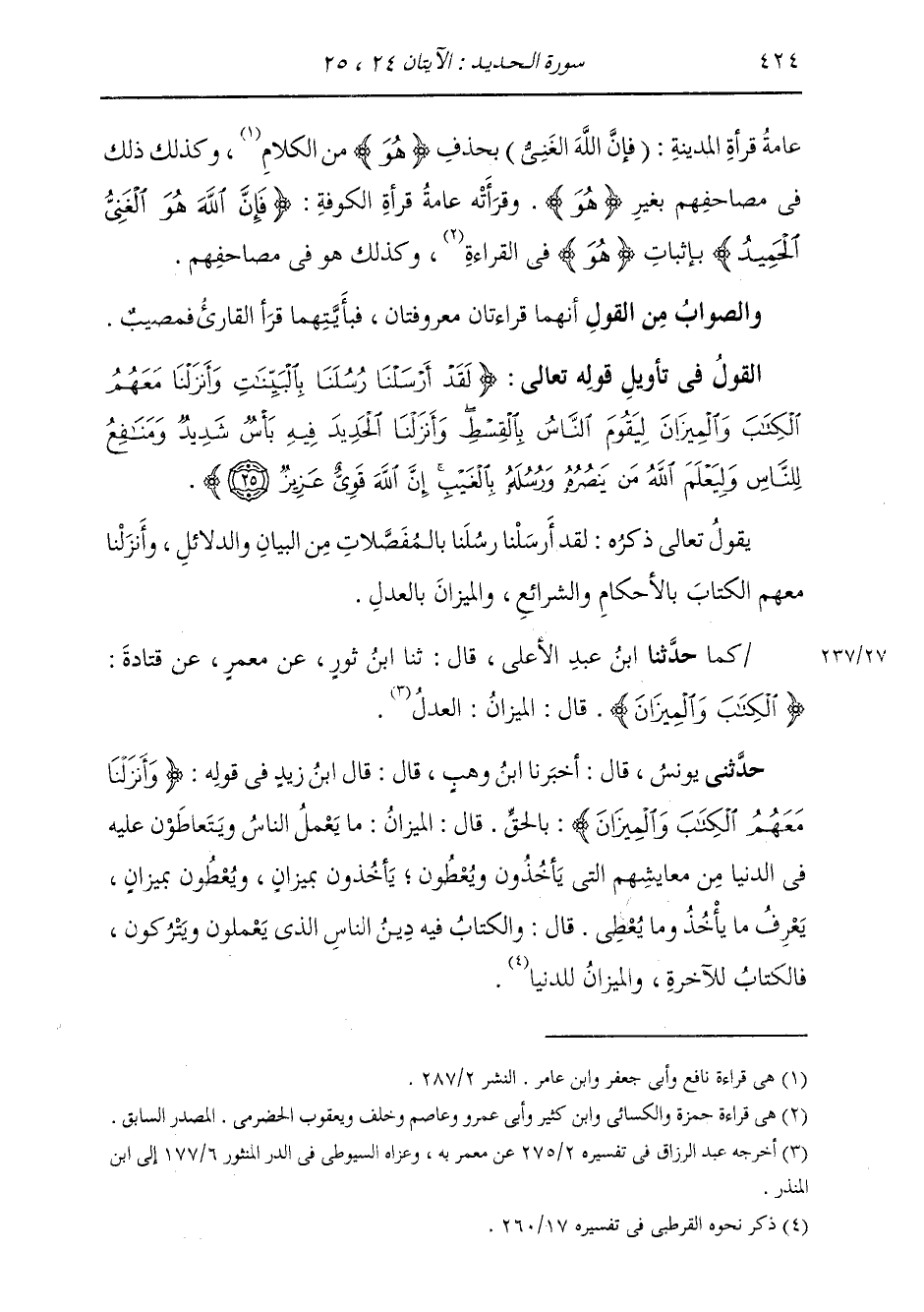 §الْقَوْلُ فِي تَأْوِيلِ قَوْلِهِ تَعَالَى: {لَقَدْ أَرْسَلْنَا رُسُلَنَا بِالْبَيِّنَاتِ وَأَنْزَلْنَا مَعَهُمُ الْكِتَابَ وَالْمِيزَانَ لِيَقُومَ النَّاسُ بِالْقِسْطِ وَأَنزَلْنَا الْحَدِيدَ فِيهِ بَأْسٌ شَدِيدٌ وَمَنَافِعُ لِلنَّاسِ وَلِيَعْلَمَ اللَّهُ مَنْ يَنْصُرُهُ وَرُسُلَهُ بِالْغَيْبِ إِنَّ اللَّهَ قَوِيُّ عَزِيزٌ} [الحديد: 25] يَقُولُ تَعَالَى ذِكْرُهُ: لَقَدْ أَرْسَلْنَا رُسُلَنَا بِالْمُفَصَّلَاتِ مِنَ الْبَيَانِ وَالدَّلَائِلِ، وَأَنْزَلْنَا مَعَهُمُ الْكِتَابَ بِالْأَحْكَامِ وَالشَّرَائِعِ، وَالْمِيزَانِ بِالْعَدْلِ