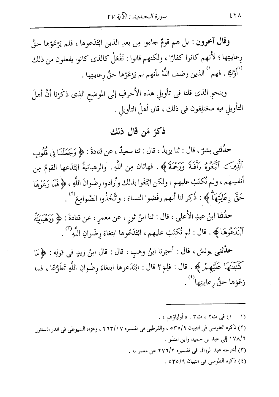 حَدَّثَنَا ابْنُ عَبْدِ الْأَعْلَى قَالَ: ثَنَا ابْنُ ثَوْرٍ، عَنْ مَعْمَرٍ، عَنْ قَتَادَةَ {§وَرَهْبَانِيَّةً ابْتَدَعُوهَا} [الحديد: 27] قَالَ: «لَمْ تُكْتَبْ عَلَيْهِمْ، ابْتَدَعُوهَا ابْتِغَاءَ رِضْوَانِ اللَّهِ»
