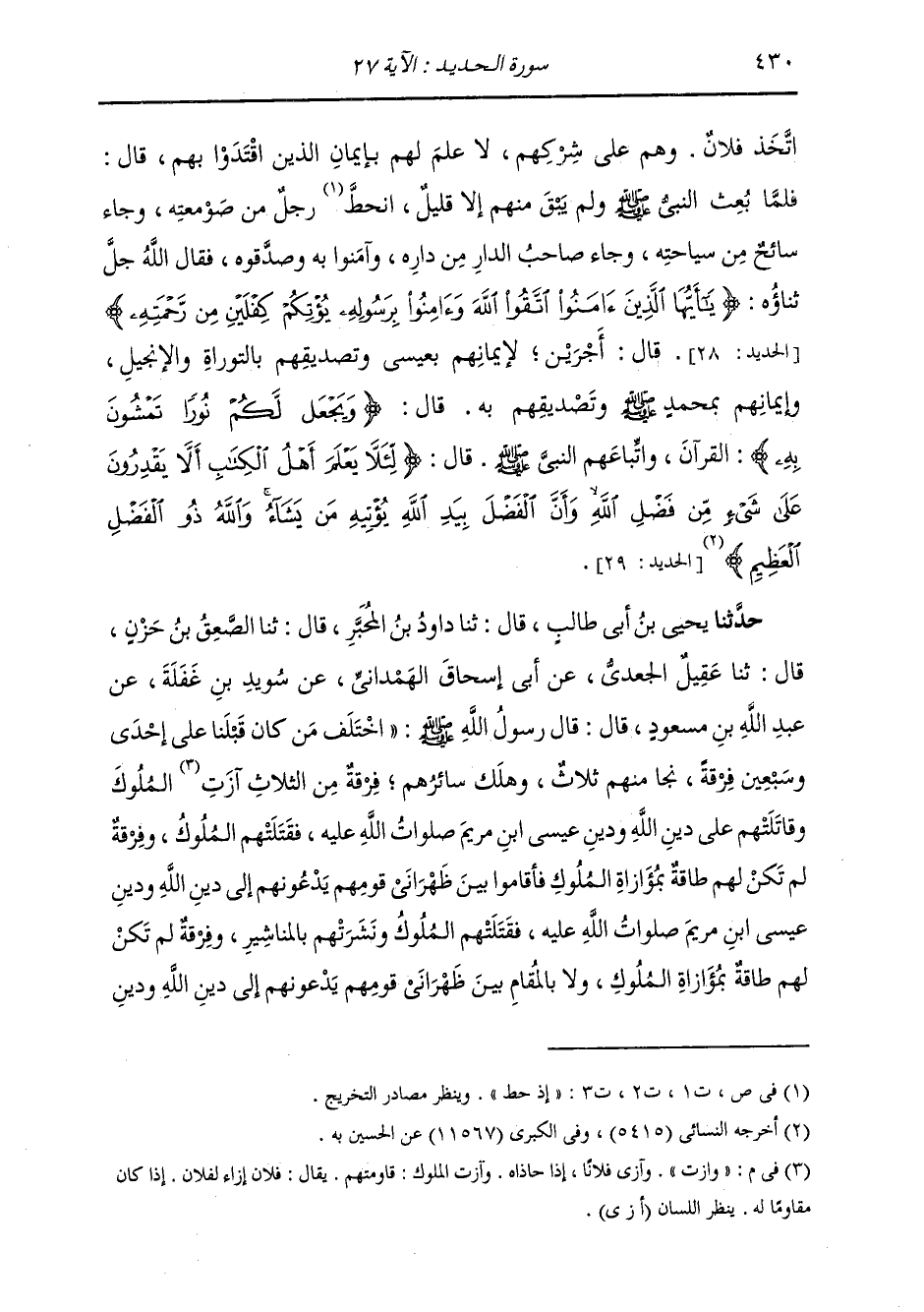 حَدَّثَنَا يَحْيَى بْنُ أَبِي طَالِبٍ قَالَ: ثَنَا دَاودُ بْنُ الْمُحَبَّرِ قَالَ: ثَنَا الصَّعْقُ بْنُ حَزْنٍ قَالَ: ثَنَا عَقِيلٌ الْجَعْدِيُّ، عَنْ أَبِي إِسْحَاقَ الْهَمْدَانِيِّ، عَنْ سُوَيْدِ بْنِ غَفَلَةَ، عَنْ عَبْدِ اللَّهِ بْنِ مَسْعُودٍ قَالَ: قَالَ رَسُولُ اللَّهِ صَلَّى اللهُ عَلَيْهِ وَسَلَّمَ: " §اخْتَلَفَ مَنْ كَانَ قَبْلَنَا عَلَى إِحْدَى وَسَبْعِينَ فِرْقَةٍ، نَجَا مِنْهُمْ ثَلَاثٌ وَهَلَكَ سَائِرُهُمْ: فِرْقَةٌ مِنَ الثَّلَاثِ وَازَتِ الْمُلُوكَ وَقَاتَلَتْهُمْ عَلَى دِينِ اللَّهِ وَدِينِ عِيسَى ابْنِ مَرْيَمَ صَلَوَاتُ اللَّهِ عَلَيْهِمْ، فَقَتَلَتْهُمُ الْمُلُوكُ؛ وَفِرْقَةٌ لَمْ تَكُنْ لَهُمْ طَاقَةٌ بِمُوَازَاةِ الْمُلُوكِ، فَأَقَامُوا بَيْنَ ظَهْرَانَيْ قَوْمِهِمْ يَدْعُونَهُمْ إِلَى دِينِ اللَّهِ وَدِينِ عِيسَى ابْنِ مَرْيَمَ صَلَوَاتُ اللَّهُ عَلَيْهِ، فَقَتَلَهُمُ الْمُلُوكُ، وَنَشَرَتْهُمْ بِالْمَنَاشِيرِ؛ وَفِرْقَةٌ لَمْ تَكُنْ لَهُمْ طَاقَةٌ بِمَوَازَاةِ الْمُلُوكِ، وَلَا بِالْمُقَامِ بَيْنَ ظَهْرَانَيْ قَوْمِهِمْ يَدْعُونَهُمْ إِلَى دِينِ اللَّهِ وَدِينِ -[431]- عِيسَى صَلَوَاتُ اللَّهُ عَلَيْهِ، فَلَحِقُوا بِالْبَرَارِي وَالْجِبَالِ، فَتَرَهَّبُوا فِيهَا، فَهُوَ قَوْلُ اللَّهِ عَزَّ وَجَلَّ " {وَرَهْبَانِيَّةً ابْتَدَعُوهَا مَا كَتَبْنَاهَا عَلَيْهِمْ} [الحديد: 27] قَالَ: «مَا فَعَلُوهَا إِلَّا ابْتِغَاءَ رِضْوَانِ اللَّهِ» {فَمَا رَعَوْهَا حَقَّ رِعَايَتِهَا} [الحديد: 27] قَالَ: «مَا رَعَاهَا الَّذِينَ مِنْ بَعْدِهِمْ حَقَّ رِعَايَتِهَا» {فَآتَيْنَا الَّذِينَ آمَنُوا مِنْهُمْ أَجْرَهُمْ} [الحديد: 27] قَالَ: «وَهُمُ الَّذِينَ آمَنُوا بِي وَصَدَّقُونِي» قَالَ {وَكَثِيرٌ مِنْهُمْ فَاسِقُونَ} [الحديد: 16] قَالَ: «فَهُمُ الَّذِينَ جَحَدُونِي وَكَذَّبُونِي»