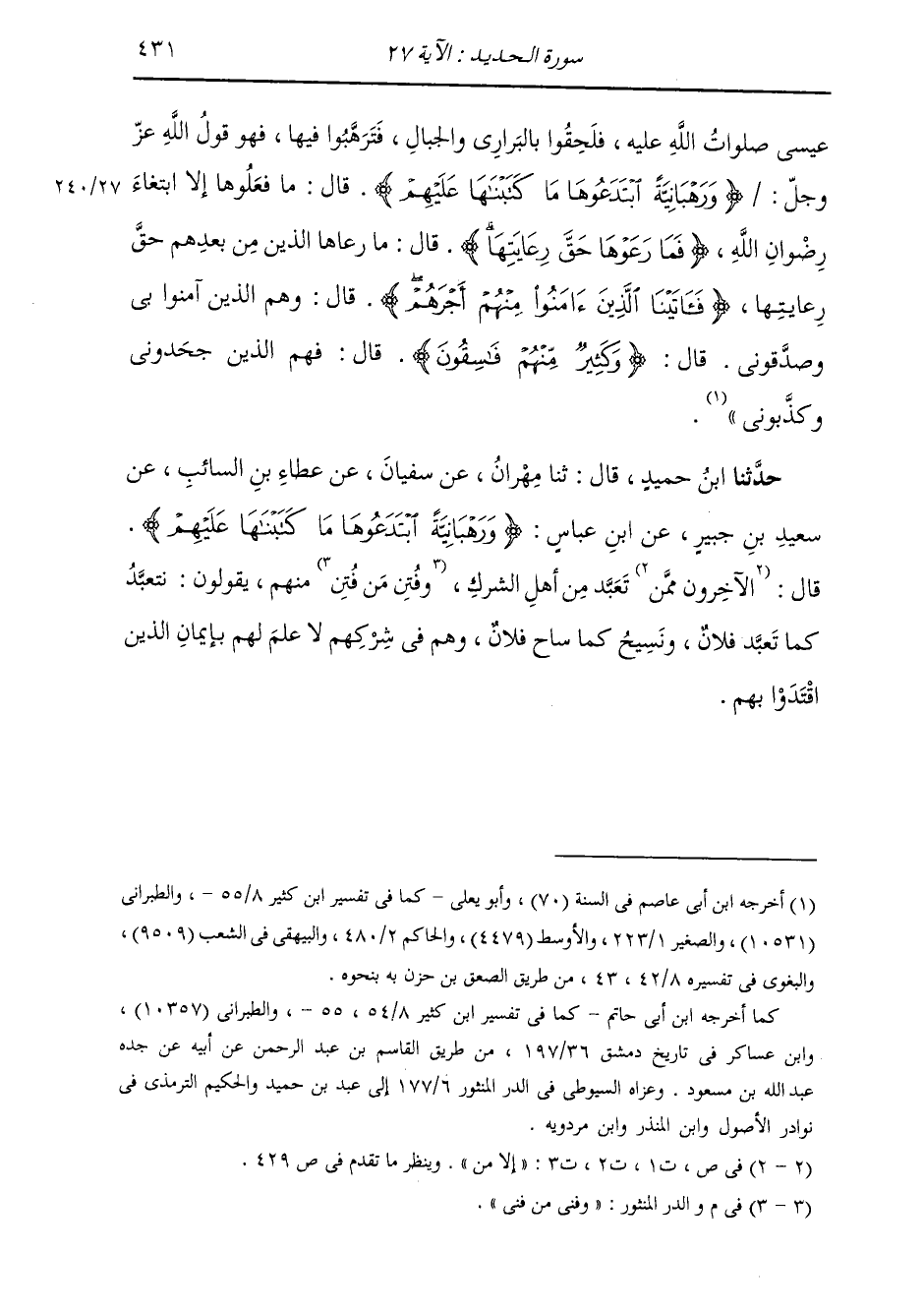 حَدَّثَنَا ابْنُ حُمَيْدٍ قَالَ: ثَنَا مِهْرَانُ، عَنْ سُفْيَانَ، عَنْ عَطَاءِ بْنِ السَّائِبِ، عَنْ سَعِيدِ بْنِ جُبَيْرٍ، عَنِ ابْنِ عَبَّاسِ {§وَرَهْبَانِيَّةً ابْتَدَعُوهَا مَا كَتَبْنَاهَا} [الحديد: 27] " قَالَ الْآخَرُونَ مِمَّنْ تَعَبَّدَ مِنْ أَهْلِ الشِّرْكِ، وَفَنِيَ مِنْ فَنِيَ مِنْهُمْ، يَقُولُونَ: نَتَعَبَّدُ كَمَا تَعَبَّدَ فُلَانٌ، وَنَسِيحُ كَمَا سَاحَ فُلَانٌ، وَهُمْ فِي شِرْكِهِمْ لَا عِلْمَ لَهُمْ بِإِيمَانِ الَّذِينَ اقْتَدُوا بِهِمْ "
