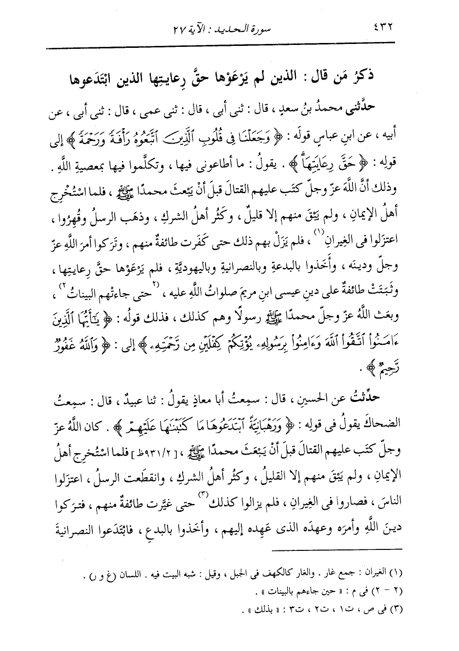ذِكْرُ مَنْ قَالَ: الَّذِينَ لَمْ يَرْعَوْهَا حَقَّ رِعَايَتِهَا: الَّذِينَ ابْتَدَعُوهَا حَدَّثَنِي مُحَمَّدُ بْنُ سَعْدٍ قَالَ: ثَنِي أَبِي قَالَ ثَنِي عَمِّي قَالَ: ثَنِي أَبِي، عَنْ أَبِيهِ، عَنِ ابْنِ عَبَّاسٍ، قَوْلَهُ: {§وَجَعَلْنَا فِي قُلُوبِ الَّذِينَ اتَّبَعُوهُ رَأْفَةً وَرَحْمَةً} [الحديد: 27] إِلَى قَوْلِهِ: {حَقَّ رِعَايَتِهَا} [الحديد: 27] يَقُولُ: «مَا أَطَاعُونِي فِيهَا، وَتَكَلَّمُوا فِيهَا بِمَعْصِيَةِ اللَّهِ، وَذَلِكَ أَنَّ اللَّهَ عَزَّ وَجَلَّ كَتَبَ عَلَيْهِمُ الْقِتَالَ قَبْلَ أَنْ يَبْعَثَ مُحَمَّدًا صَلَّى اللهُ عَلَيْهِ وَسَلَّمَ، فَلَمَّا اسْتُخْرِجَ أَهْلُ الْإِيمَانِ، وَلَمْ يَبْقَ مِنْهُمْ إِلَّا قَلِيلٌ، وَكَثُرَ أَهْلُ الشِّرْكِ وَذَهَبَ الرُّسُلُ وَقُهِرُوا، اعْتَزَلُوا فِي الْغِيرَانِ، فَلَمْ يَزَلْ بِهِمْ ذَلِكَ حَتَّى كَفَرَتْ طَائِفَةٌ مِنْهُمْ، وَتَرَكُوا أَمْرَ اللَّهِ عَزَّ وَجَلَّ وَدِينَهُ، وَأَخَذُوا بِالْبِدْعَةِ وَبِالنَّصْرَانِيَّةِ وَبِالْيَهُودِيَّةِ، فَلَمْ يَرْعَوْهَا حَقَّ رِعَايَتِهَا وَثَبَتَتْ طَائِفَةٌ عَلَى دِينِ عِيسَى ابْنِ مَرْيَمَ صَلَوَاتُ اللَّهُ عَلَيْهِ، حِينَ جَاءَهُمْ بِالْبَيِّنَاتِ وَبَعَثَ اللَّهُ عَزَّ وَجَلَّ مُحَمَّدًا رَسُولًا صَلَّى اللَّهُ عَلَيْه وَسَلَّمَ وَهُمْ كَذَلِكَ فَذَلِكَ قَوْلُهُ» : {يَا أَيُّهَا الَّذِينَ آمَنُوا اتَّقُوا اللَّهَ وَآمِنُوا بِرَسُولِهِ يُؤْتِكُمْ كِفْلَيْنِ مِنْ رَحْمَتِهِ} [الحديد: 28] إِلَى {وَاللَّهُ غَفُورٌ رَحِيمٌ} [البقرة: 218]