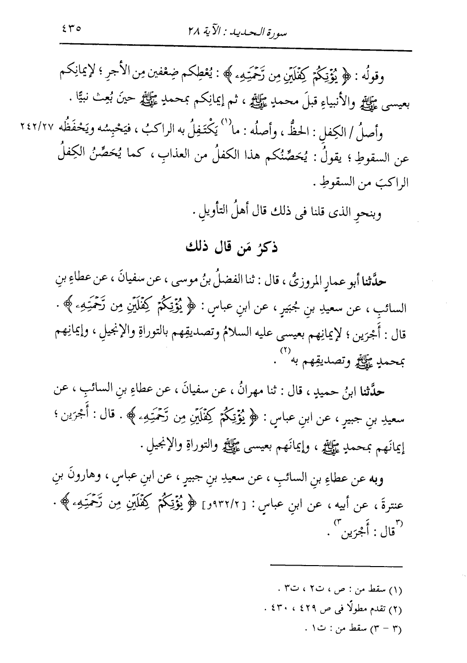 ذِكْرُ مَنْ قَالَ ذَلِكَ: حَدَّثَنَا أَبُو عَمَّارٍ الْمَرْوَزِيُّ قَالَ: ثَنَا الْفَضْلُ بْنُ مُوسَى، عَنْ سُفْيَانَ، عَنْ عَطَاءِ بْنِ السَّائِبِ، عَنْ سَعِيدِ بْنِ جُبَيْرٍ، عَنِ ابْنِ عَبَّاسٍ، {§يُؤْتِكُمْ كِفْلَيْنِ مِنْ رَحْمَتِهِ} [الحديد: 28] قَالَ: «أَجْرَيْنِ، لِإِيمَانِهِمْ بِعِيسَى صَلَّى اللهُ عَلَيْهِ وَسَلَّمَ، وَتَصْدِيقِهِمْ بِالتَّوْرَاةِ وَالْإِنْجِيلِ، وَإِيمَانِهِمْ بِمُحَمَّدٍ صَلَّى اللهُ عَلَيْهِ وَسَلَّمَ، وَتَصْدِيقِهِمْ بِهِ»