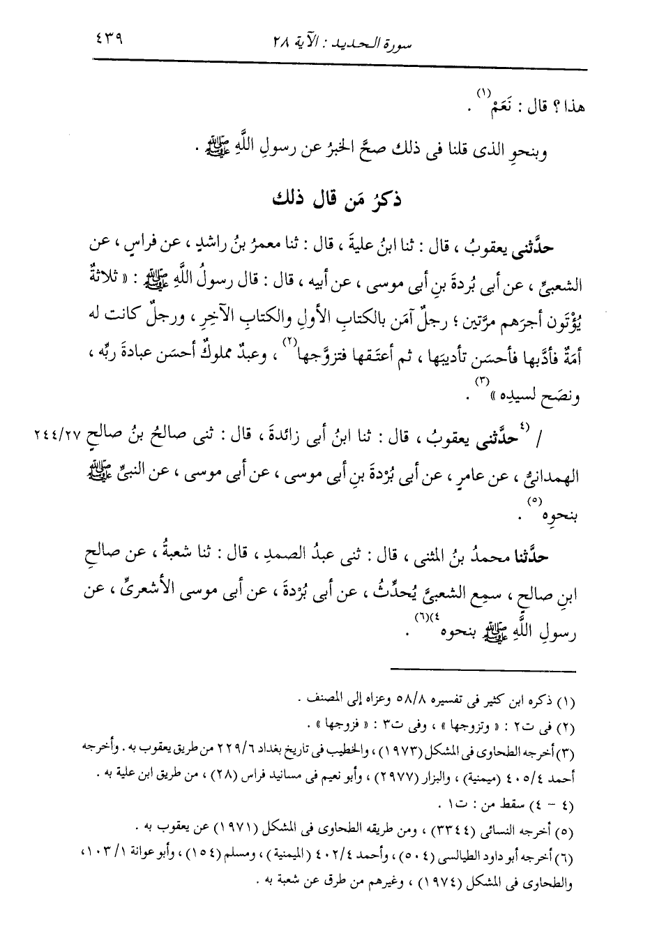 ذِكْرُ مَنْ قَالَ ذَلِكَ: حَدَّثَنِي يَعْقُوبُ قَالَ: ثَنَا ابْنُ عُلَيَّةَ قَالَ: ثَنَا مَعْمَرُ بْنُ رَاشِدٍ، عَنْ فِرَاسٍ، عَنِ الشَّعْبِيِّ، عَنْ أَبِي بُرْدَةَ بْنِ أَبِي مُوسَى، عَنْ أَبِيهِ قَالَ: قَالَ رَسُولُ اللَّهِ صَلَّى اللهُ عَلَيْهِ وَسَلَّمَ: " §ثَلَاثَةٌ يُؤْتَوْنَ أَجْرَهُمْ مَرَّتَيْنِ: رَجُلٌ آمَنَ بِالْكِتَابِ الْأَوَّلِ وَالْكِتَابِ الْآخَرِ، وَرَجُلٌ كَانَتْ لَهُ أَمَةٌ فَأَدَّبَهَا وَأَحْسَنَ تَأْدِيبَهَا، ثُمَّ أَعْتَقَهَا فَتَزَوَّجَهَا، وَعَبْدٌ مَمْلُوكٌ أَحْسَنَ عِبَادَةَ رَبِّهِ، وَنَصَحَ لِسَيِّدِهِ " حَدَّثَنِي يَعْقُوبُ قَالَ: ثَنَا ابْنُ أَبِي زَائِدَةَ قَالَ: ثَنِي صَالِحُ بْنُ صَالِحٍ الْهَمْدَانِيُّ، عَنْ عَامِرٍ، عَنْ أَبِي بُرْدَةَ بْنِ أَبِي مُوسَى، عَنْ أَبِي مُوسَى، عَنِ النَّبِيِّ صَلَّى اللهُ عَلَيْهِ وَسَلَّمَ، بِنَحْوِهِ حَدَّثَنَا مُحَمَّدُ بْنُ الْمُثَنَّى قَالَ: ثَنِي عَبْدُ الصَّمَدِ قَالَ: ثَنَا شُعْبَةُ، عَنْ صَالِحِ بْنِ صَالِحٍ، سَمِعَ الشَّعْبِيَّ يُحَدِّثُ، عَنْ أَبِي بُرْدَةَ، عَنْ أَبِي مُوسَى الْأَشْعَرِيِّ، عَنْ رَسُولِ اللَّهِ صَلَّى اللَّهُ عَلَيْه وَسَلَّمَ بِنَحْوِهِ