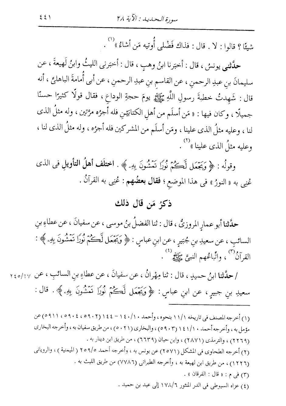 حَدَّثَنَا ابْنُ حُمَيْدٍ قَالَ: ثَنَا مِهْرَانُ، عَنْ سُفْيَانَ، عَنْ عَطَاءِ بْنِ السَّائِبِ، عَنْ سَعِيدِ بْنِ جُبَيْرٍ، عَنِ ابْنِ عَبَّاسٍ {§وَيَجْعَلْ لَكُمْ نُورًا تَمْشُونَ بِهِ} [الحديد: 28] قَالَ: «-[442]- الْفُرْقَانَ، وَاتِّبَاعَهُمُ النَّبِيَّ صَلَّى اللهُ عَلَيْهِ وَسَلَّمَ»