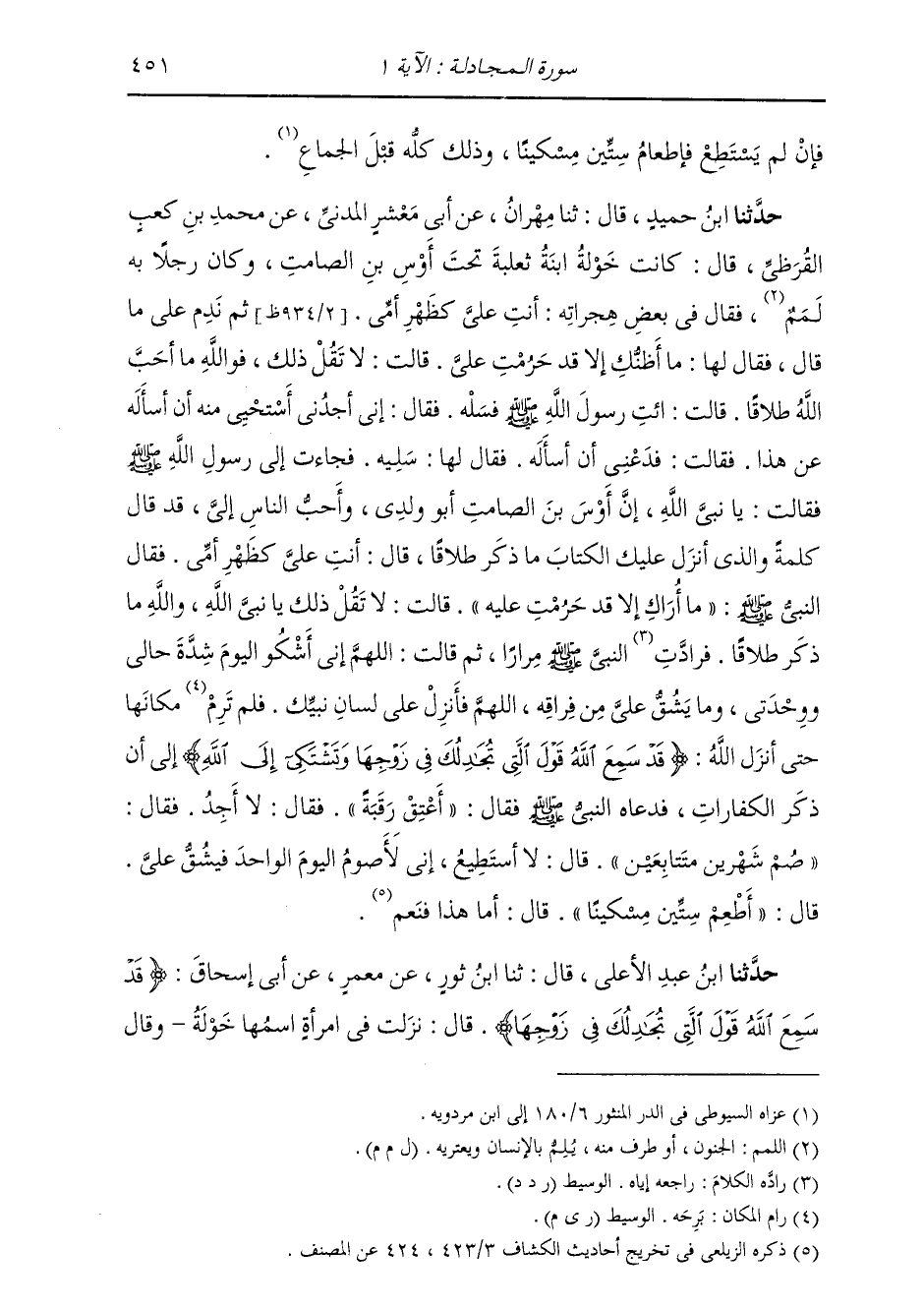 حَدَّثَنَا ابْنُ حُمَيْدٍ، قَالَ: ثنا مِهْرَانُ، عَنْ أَبِي مَعْشَرٍ الْمَدَنِيِّ، عَنْ مُحَمَّدِ بْنِ كَعْبٍ الْقُرَظِيِّ، قَالَ: كَانَتْ خَوْلَةُ ابْنَةُ ثَعْلَبَةَ تَحْتَ أَوْسِ بْنِ الصَّامِتِ، وَكَانَ رَجُلًا بِهِ لَمَمٌ، فَقَالَ فِي بَعْضِ هِجْرَاتِهِ: أَنْتِ عَلَيَّ كَظَهْرِ أُمِّي، ثُمَّ نَدِمَ عَلَى مَا قَالَ، فَقَالَ لَهَا: مَا أَظُنُّكِ إِلَّا قَدْ حَرُمْتِ عَلَيَّ. قَالَتْ: لَا تَقُلْ ذَلِكَ، فَوَاللَّهِ مَا أَحَبَّ اللَّهُ طَلَاقًا. قَالَتِ: ائْتِ رَسُولَ اللَّهِ صَلَّى اللهُ عَلَيْهِ وَسَلَّمَ فَسَلْهُ. فَقَالَ: إِنِّي أَجِدُنِي أَسْتَحِي مِنْهُ أَنْ أَسْأَلَهُ عَنْ هَذَا، فَقَالَتْ: فَدَعْنِي أَنْ أَسْأَلَهُ، فَقَالَ لَهَا: سَلِيهِ؛ فَجَاءَتْ إِلَى رَسُولِ اللَّهِ صَلَّى اللهُ عَلَيْهِ وَسَلَّمَ، فَقَالَتْ: يَا نَبِيَّ اللَّهِ إِنَّ أَوْسَ بْنَ الصَّامِتِ أَبُو وَلَدِي، وَأَحَبُّ النَّاسِ إِلَيَّ، قَدْ قَالَ كَلِمَةً، وَالَّذِي أَنْزَلَ عَلَيْكَ الْكِتَابَ مَا ذَكَرَ طَلَاقًا، قَالَ: أَنْتِ عَلَيَّ كَظَهْرِ أُمِّي. فَقَالَ النَّبِيُّ صَلَّى اللهُ عَلَيْهِ وَسَلَّمَ: «§مَا أَرَاكِ إِلَّا قَدْ حَرُمْتِ عَلَيْهِ» . قَالَتْ: لَا تَقُلْ ذَلِكَ يَا نَبِيَّ اللَّهِ، وَاللَّهِ مَا ذَكَرَ طَلَاقًا؛ فَرَادَّتِ النَّبِيَّ صَلَّى اللهُ عَلَيْهِ وَسَلَّمَ مِرَارًا، ثُمَّ قَالَتِ: اللَّهُمَّ إِنِّي أَشْكُو الْيَوْمَ شِدَّةَ حَالِي وَوَحْدَتِي، وَمَا يَشُقُّ عَلَيَّ مِنْ فِرَاقِهِ، اللَّهُمَّ فَأَنْزِلْ عَلَى لِسَانِ نَبِيِّكَ. فَلَمْ تَرِمْ مَكَانَهَا حَتَّى أَنْزَلَ اللَّهُ {قَدْ سَمِعَ اللَّهُ قَوْلَ الَّتِي تُجَادِلُكَ فِي زَوْجِهَا وَتَشْتَكِي إِلَى اللَّهِ} [المجادلة: 1] إِلَى أَنْ ذَكَرَ الْكَفَّارَاتِ، فَدَعَاهُ النَّبِيُّ صَلَّى اللهُ عَلَيْهِ وَسَلَّمَ فَقَالَ: «أَعْتِقْ رَقَبَةً» . لَا أَجِدُ، فَقَالَ: «صُمْ شَهْرَيْنِ مُتَتَابِعَيْنِ» قَالَ: لَا أَسْتَطِيعُ، إِنِّي لَأَصُومُ الْيَوْمَ الْوَاحِدَ فَيَشُقُّ عَلَيَّ. قَالَ: «أَطْعِمْ سِتِّينَ مِسْكِينًا؟» قَالَ: أَمَّا هَذَا فَنَعَمْ