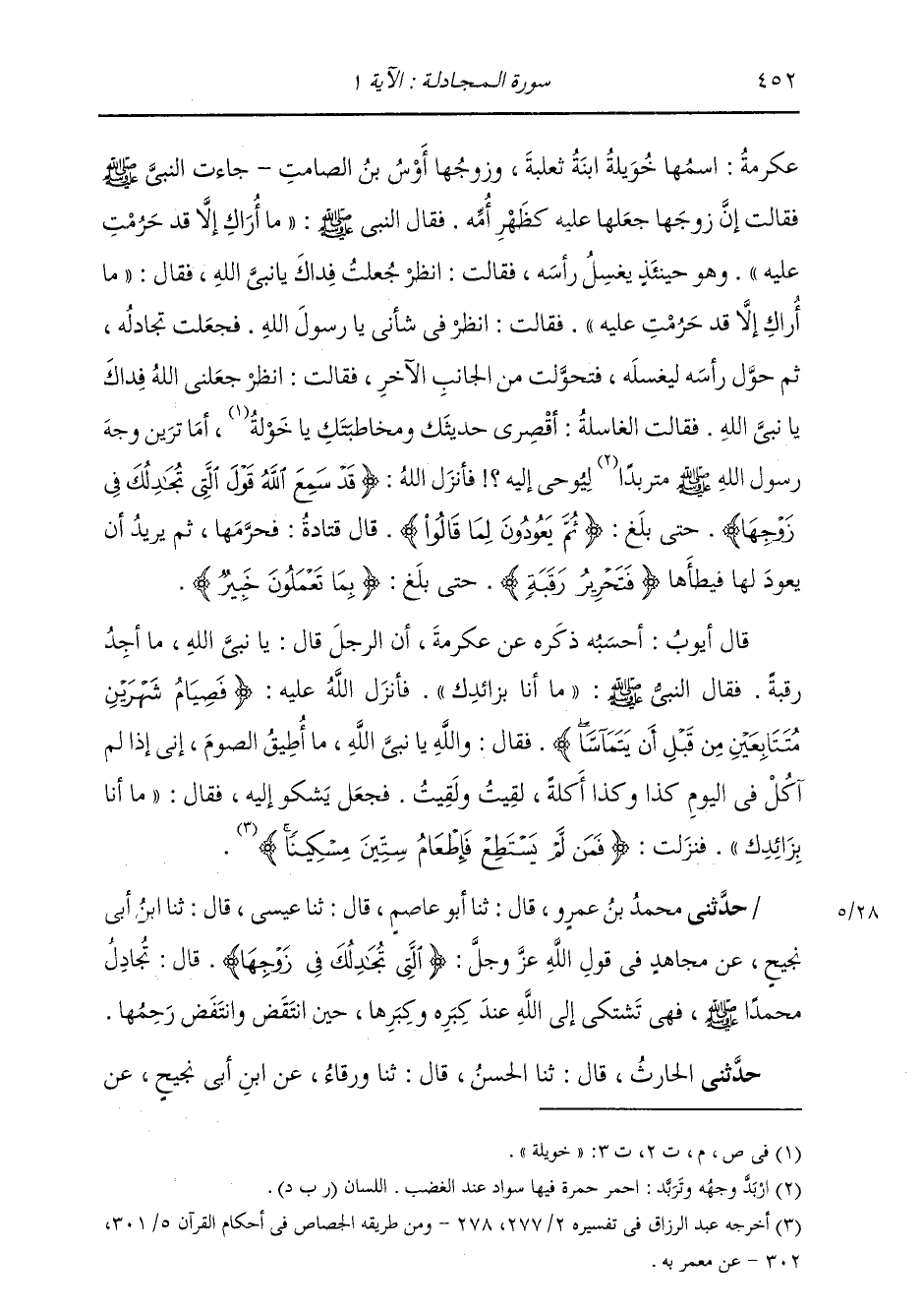حَدَّثَنِي مُحَمَّدُ بْنُ عَمْرٍو، قَالَ: ثنا أَبُو عَاصِمٍ، قَالَ: ثنا عِيسَى، قَالَ: ثنا ابْنُ أَبِي نَجِيحٍ، عَنْ مُجَاهِدٍ، فِي قَوْلِ اللَّهِ عَزَّ وَجَلَّ: {الَّتِي تُجَادِلُكَ فِي زَوْجِهَا} [المجادلة: 1] قَالَ: §تُجَادِلُ مُحَمَّدًا صَلَّى اللهُ عَلَيْهِ وَسَلَّمَ، فَهِيَ تَشْتَكِي إِلَى اللَّهِ عِنْدَ كِبَرِهِ وَكِبَرِهَا حَتَّى انْتَفَضَ وَانْتَفَضَ رَحِمَهَا. حَدَّثَنِي الْحَارِثُ، قَالَ: ثنا الْحَسَنُ، قَالَ: ثنا وَرْقَاءُ، عَنِ ابْنِ أَبِي نَجِيحٍ، عَنْ -[453]- مُجَاهِدٍ، فِي قَوْلِ اللَّهِ {الَّتِي تُجَادِلُكَ فِي زَوْجِهَا} [المجادلة: 1] قَالَ: مُحَمَّدًا فِي زَوْجِهَا قَدْ ظَاهَرَ مِنْهَا، وَهِيَ تَشْتَكِي إِلَى اللَّهِ، ثُمَّ ذَكَرَ سَائِرَ الْحَدِيثِ نَحْوَهُ