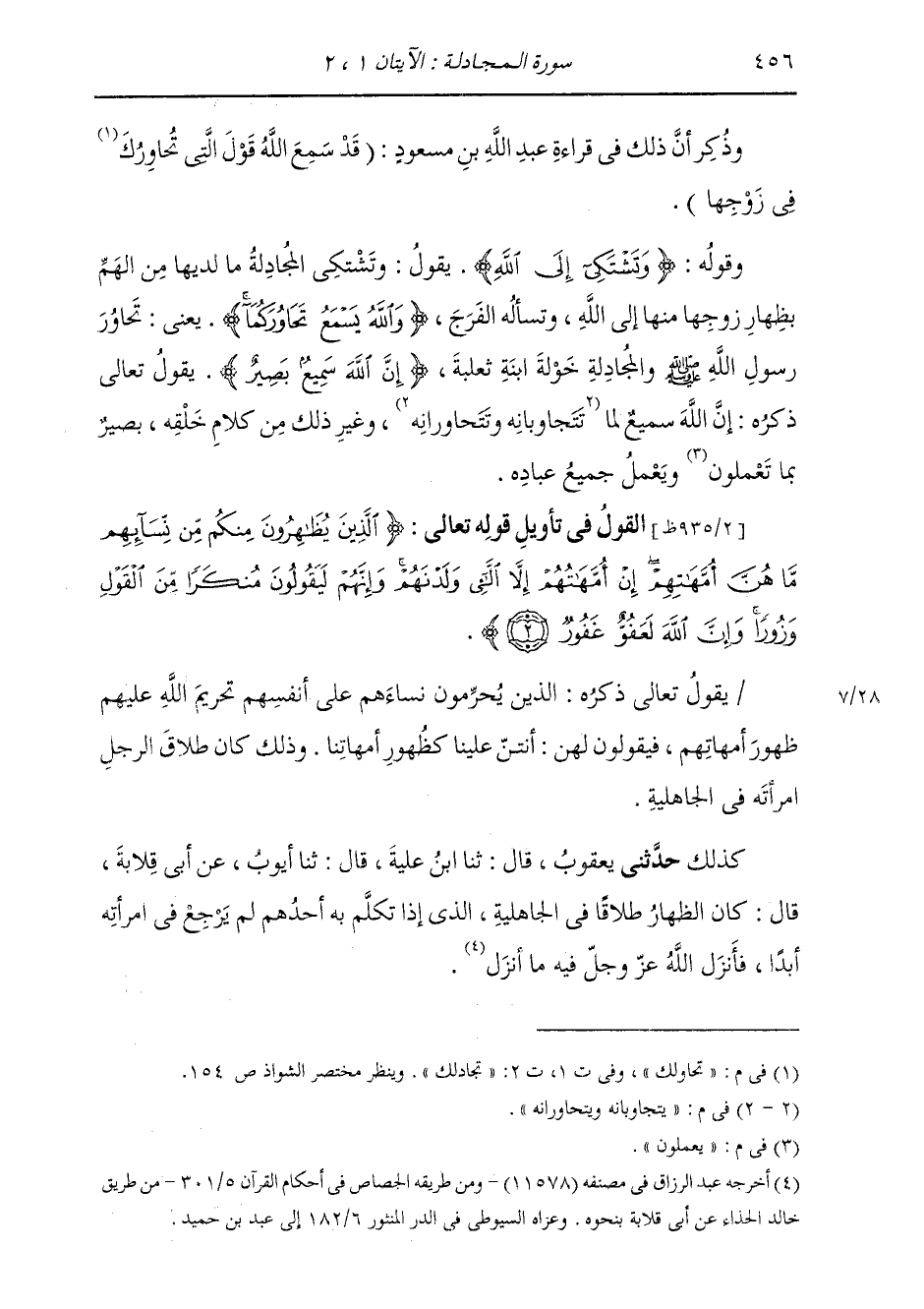 §الْقَوْلُ فِي تَأْوِيلِ قَوْلِهِ تَعَالَى: {الَّذِينَ يُظَاهِرُونَ مِنْكُمْ مِنْ نِسَائِهِمْ مَا هُنَّ أُمَّهَاتِهِمْ إِنْ أُمَّهَاتُهُمْ إِلَّا اللَّائِي وَلَدْنَهُمْ وَإِنَّهُمْ لَيَقُولُونَ مُنْكَرًا مِنَ الْقَوْلِ وَزُورًا وَإِنَّ اللَّهَ لَعَفُوٌّ غَفُورٌ} [المجادلة: 2] يَقُولُ تَعَالَى ذِكْرُهُ: الَّذِينَ يُحَرِّمُونَ نِسَاءَهُمْ عَلَى أَنْفُسِهِمْ تَحْرِيمَ اللَّهِ عَلَيْهِمْ ظُهُورَ أُمَّهَاتِهِمْ، فَيَقُولُونَ لَهُنَّ: أَنْتُنَّ عَلَيْنَا كَظُهُورِ أُمَّهَاتِنَا، وَذَلِكَ كَانَ طَلَاقَ الرَّجُلِ امْرَأَتَهُ فِي الْجَاهِلِيَّةِ.