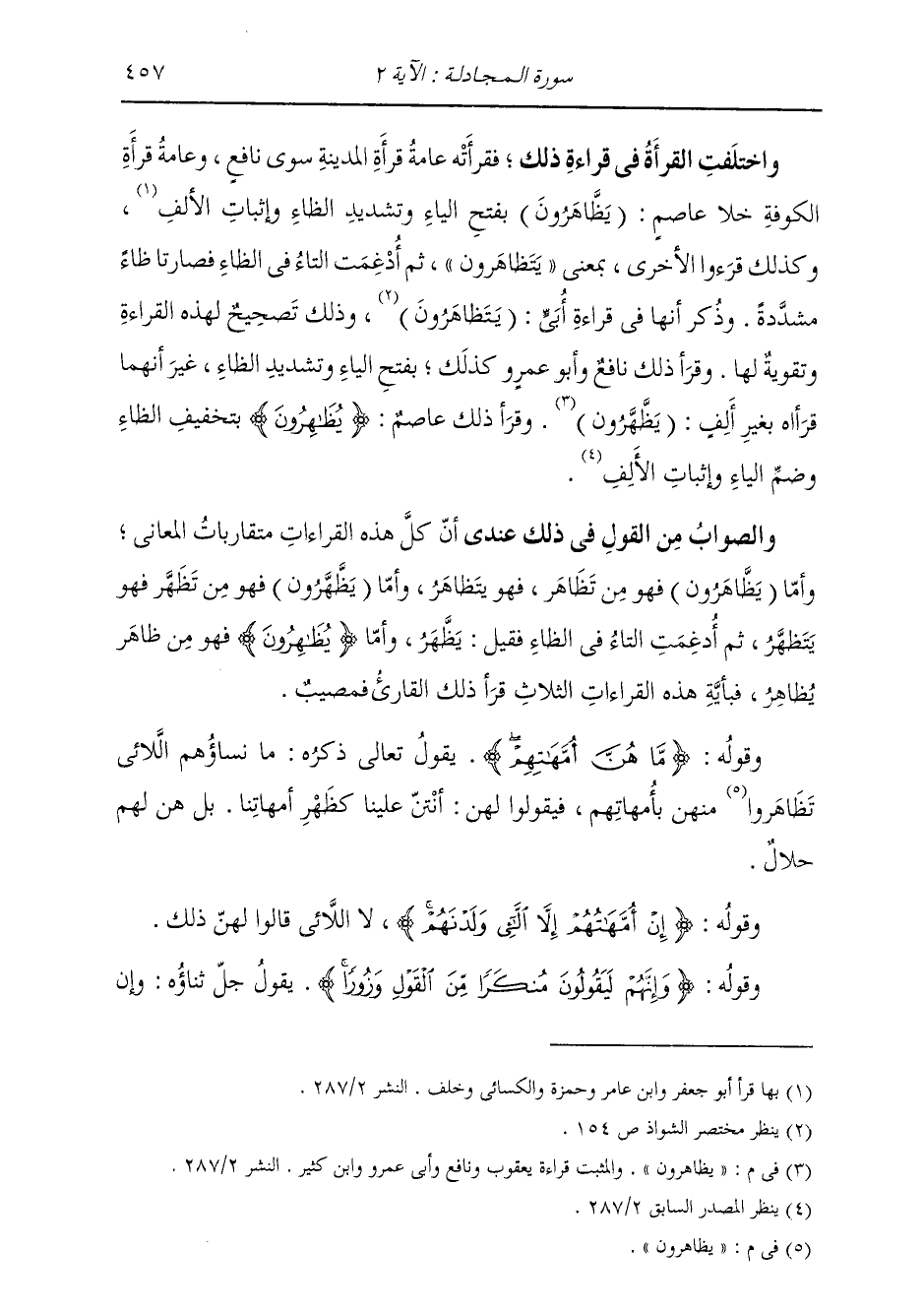 وَاخْتَلَفَتِ الْقُرَّاءُ فِي قِرَاءَةِ ذَلِكَ، فَقَرَأَتْهُ عَامَّةُ قُرَّاءِ الْمَدِينَةِ سِوَى نَافِعٍ، وَعَامَّةُ قُرَّاءِ الْكُوَفَةِ خَلَا عَاصِمٍ: (يَظَّاهَرُونَ) بِفَتْحِ الْيَاءِ وَتَشْدِيدِ الظَّاءِ وَإِثْبَاتِ الْأَلِفِ، وَكَذَلِكَ قَرَءُوا الْأُخْرَى بِمَعْنَى: يَتَظَاهَرُونَ، ثُمَّ أُدْغِمَتِ التَّاءُ فِي الظَّاءِ فَصَارَتَا ظَاءً مُشَدَّدَةً. وَذُكِرَ أَنَّهَا فِي قِرَاءَةِ أُبَيٍّ: «يَتَظَاهَرُونَ» وَذَلِكَ تَصْحِيحٌ لِهَذِهِ الْقِرَاءَةِ وَتَقْوِيَةٌ لَهَا؛ وَقَرَأَ ذَلِكَ نَافِعٌ وَأَبُو عَمْرٍو وَكَذَلِكَ بِفَتْحِ الْيَاءِ وَتَشْدِيدِ الظَّاءِ، غَيْرَ أَنَّهُمَا قَرَآهُ بِغَيْرِ أَلِفٍ: (يَظَّهَّرُونَ) . وَقَرَأَ ذَلِكَ عَاصِمٌ: {يُظَاهِرُونَ} [المجادلة: 3] بِتَخْفِيفِ الظَّاءِ وَضَمِّ الْيَاءِ وَإِثْبَاتِ الْأَلِفِ. وَالصَّوَابُ مِنَ الْقَوْلِ فِي ذَلِكَ عِنْدِي أَنَّ كُلَّ هَذِهِ الْقِرَاءَاتِ مُتَقَارِبَاتُ الْمَعَانِي. وَأَمَّا (يَظَّاهَرُونَ) فَهُوَ مِنْ تَظَاهَرَ، فَهُوَ يَتَظَاهَرُ. وَأَمَّا (يَظَّهَّرُونَ) فَهُوَ مِنْ تَظَهَّرَ فَهُوَ يَتَظَهَّرُ، ثُمَّ أُدْغِمَتِ التَّاءُ فِي الظَّاءِ فَقِيلَ: يَظَّهَّرُ. وَأَمَّا {يُظَاهِرُونَ} [المجادلة: 2] فَهُوَ مِنْ ظَاهَرَ يُظَاهِرُ، فَبِأَيَّةِ هَذِهِ الْقِرَاءَاتِ الثَّلَاثِ قَرَأَ ذَلِكَ الْقَارِئُ فَمُصِيبٌ