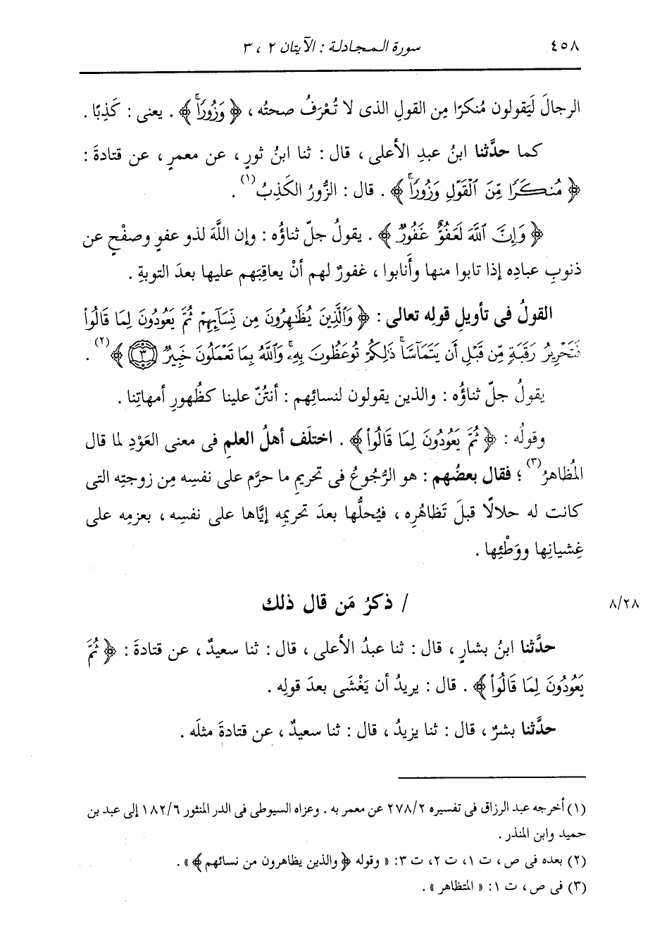 ذِكْرُ مَنْ قَالَ ذَلِكَ: حَدَّثَنَا ابْنُ بَشَّارٍ، قَالَ: ثنا عَبْدُ الْأَعْلَى، قَالَ: ثنا سَعِيدٌ، عَنْ قَتَادَةَ، {§ثُمَّ يَعُودُونَ لِمَا قَالُوا} [المجادلة: 3] قَالَ: يُرِيدُ أَنْ يَغْشَى بَعْدَ قَوْلِهِ. حَدَّثَنَا بِشْرٌ، قَالَ: ثنا يَزِيدُ، قَالَ: ثنا سَعِيدٌ، عَنْ قَتَادَةَ، مِثْلَهُ