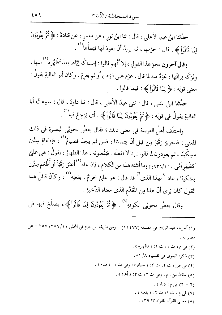 حَدَّثَنَا ابْنُ الْمُثَنَّى، قَالَ: ثني عَبْدُ الْأَعْلَى، قَالَ: ثنا دَاوُدُ، قَالَ: سَمِعْتُ أَبَا الْعَالِيَةِ، يَقُولُ فِي قَوْلِهِ: {§ثُمَّ يَعُودُونَ لِمَا قَالُوا} [المجادلة: 3] أَيْ يَرْجِعُ فِيهِ وَاخْتَلَفَ أَهْلُ الْعَرَبِيَّةِ فِي مَعْنَى ذَلِكَ، فَقَالَ بَعْضُ نَحْوِيِّ الْبَصْرَةِ فِي ذَلِكَ الْمَعْنَى: فَتَحْرِيرُ رَقَبَةٍ مِنْ قَبْلِ أَنْ يَتَمَاسَّا، فَمَنْ لَمْ يَجِدْ فَصِيَامٌ، فَإِطْعَامُ سِتِّينَ مِسْكِينًا، ثُمَّ يَعُودُونَ لِمَا قَالُوا إِنَّا لَا نَفْعَلُهُ فَيَفْعَلُونَهُ هَذَا الظِّهَارَ يَقُولُ: هِيَ عَلَيَّ كَظَهْرِ أُمِّي، وَمَا أَشْبَهَ هَذَا مِنَ الْكَلَامِ، فَإِذَا أَعْتَقَ رَقَبَةً أَوْ أَطْعَمَ سِتِّينَ مِسْكِينًا عَادَ لِمَا قَدْ قَالَ: هُوَ عَلَيَّ حَرَامٌ يَفْعَلُهُ. وَكَأَنَّ قَائِلَ هَذَا الْقَوْلَ كَانَ يَرَى أَنَّ هَذَا مِنَ الْمُقَدَّمِ الَّذِي مَعْنَاهُ التَّأْخِيرُ. وَقَالَ بَعْضُ نَحْوِيِّ الْكُوَفَةِ ثُمَّ يَعُودُونَ لِمَا قَالُوا يَصْلُحُ فِيهَا فِي