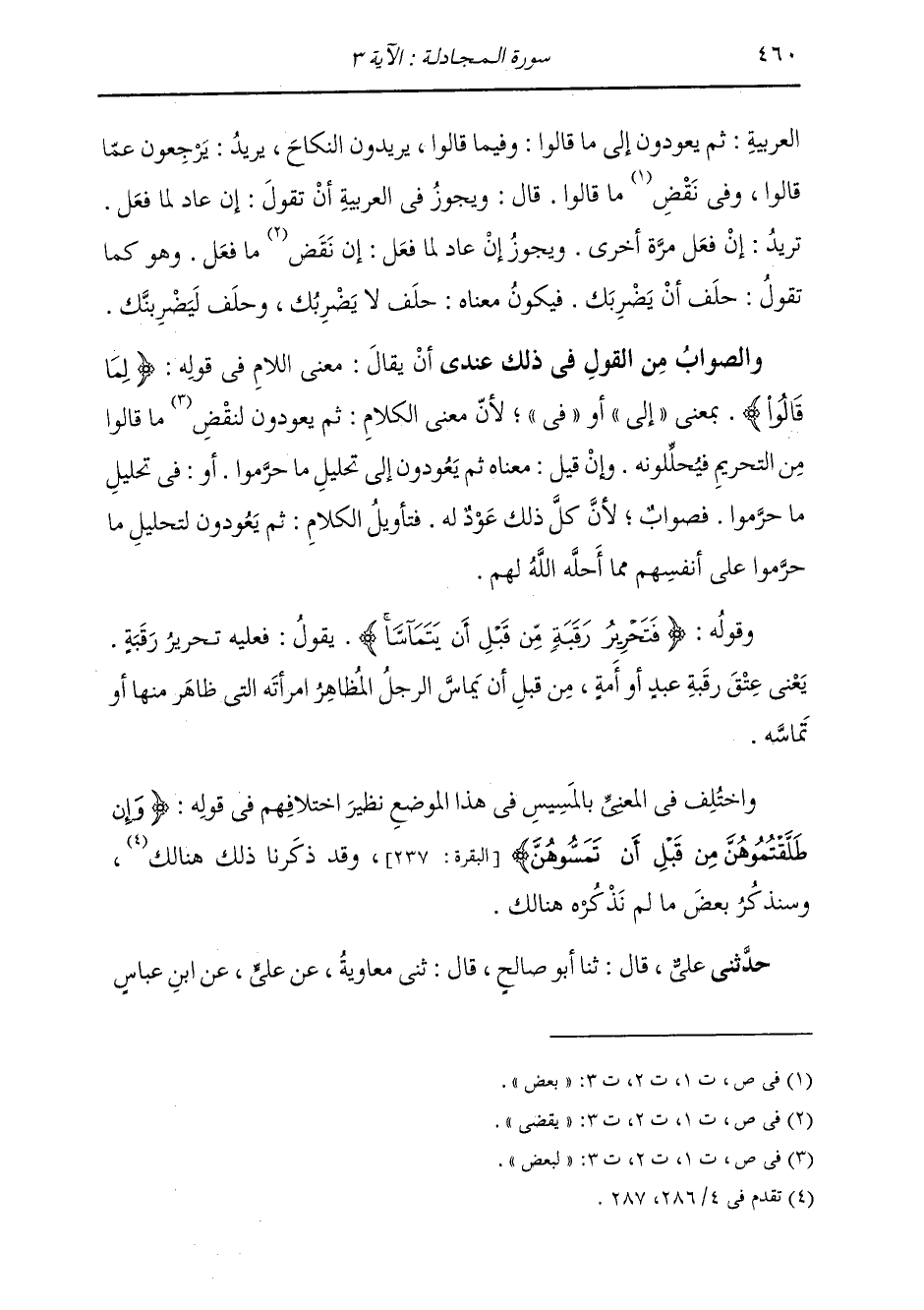 الْعَرَبِيَّةِ: ثُمَّ يَعُودُونَ إِلَى مَا قَالُوا، وَفِيمَا قَالُوا، يُرِيدُونَ النِّكَاحَ، يُرِيدُ: يَرْجِعُونَ عَمَّا قَالُوا، وَفِي نَقْضِ مَا قَالُوا، قَالَ: وَيَجُوزُ فِي الْعَرَبِيَّةِ أَنْ تَقُولَ: إِنْ عَادَ لِمَا فَعَلَ، تُرِيدُ إِنْ فَعَلَ مَرَّةً أُخْرَى، وَيَجُوزُ إِنْ عَادَ لِمَا فَعَلَ: إِنْ نَقَضَ مَا فَعَلَ، وَهُوَ كَمَا تَقُولُ: حَلَفَ أَنْ يَضْرِبَكَ، فَيَكُونَ مَعْنَاهُ: حَلَفَ لَا يَضْرِبُكَ، وَحَلَفَ لَيَضْرِبَنَّكَ. وَالصَّوَابُ مِنَ الْقَوْلِ فِي ذَلِكَ عِنْدِي أَنْ يُقَالَ: مَعْنَى اللَّامِ فِي قَوْلِهِ: {لِمَا قَالُوا} [المجادلة: 3] بِمَعْنَى إِلَى أَوْ فِي، لِأَنَّ مَعْنَى الْكَلَامِ: ثُمَّ يَعُودُونَ لِنَقْضِ مَا قَالُوا مِنَ التَّحْرِيمِ فَيُحَلِّلُونَهُ. وَإِنْ قِيلَ مَعْنَاهُ: ثُمَّ يَعُودُونَ إِلَى تَحْلِيلِ مَا حَرَّمُوا، أَوْ فِي تَحْلِيلِ مَا حَرَّمُوا فَصَوَابٌ؛ لِأَنَّ كُلَّ ذَلِكَ عَوْدٌ لَهُ، فتَأْوِيلُ الْكَلَامِ: ثُمَّ يَعُودُونَ لِتَحْلِيلِ مَا حَرَّمُوا عَلَى أَنْفُسِهِمْ مِمَّا أَحَلَّهُ اللَّهُ لَهُمْ. وَقَوْلُهُ: {فَتَحْرِيرُ رَقَبَةٍ مِنْ قَبْلِ أَنْ يَتَمَاسَّا} [المجادلة: 3] يَقُولُ: فَعَلَيْهِ تَحْرِيرُ رَقَبَةٍ، يَعْنِي عِتْقَ رَقَبَةٍ عَبْدٍ أَوْ أَمَةٍ، مِنْ قَبْلِ أَنْ يَمَاسَّ الرَّجُلُ الْمُظَاهِرُ امْرَأَتَهُ الَّتِي ظَاهَرَ مِنْهَا أَوْ تَمَاسَّهُ. وَاخْتُلِفَ فِي الْمَعْنَى بِالْمَسِيسِ فِي هَذَا الْمَوْضِعِ نَظِيرَ اخْتِلَافِهِمْ فِي قَوْلِهِ: {وَإِنْ طَلَّقْتُمُوهُنَّ مِنْ قَبْلِ أَنْ تَمَسُّوهُنَّ} [البقرة: 237] . وَقَدْ ذَكَرْنَا ذَلِكَ هُنَالِكَ. وَسَنَذْكُرُ بَعْضَ مَا لَمْ نَذْكُرْهُ هُنَالِكَ: