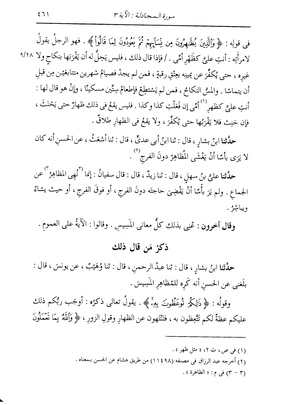 ذِكْرُ مَنْ قَالَ ذَلِكَ: حَدَّثَنَا ابْنُ بَشَّارٍ، قَالَ: ثنا عَبْدُ الرَّحْمَنِ، قَالَ: ثنا وُهَيْبٌ، عَنْ يُونُسَ، قَالَ: بَلَغَنِي عَنِ الْحَسَنِ، أَنَّهُ §كَرِهَ لِلْمُظَاهِرِ الْمَسِيسَ