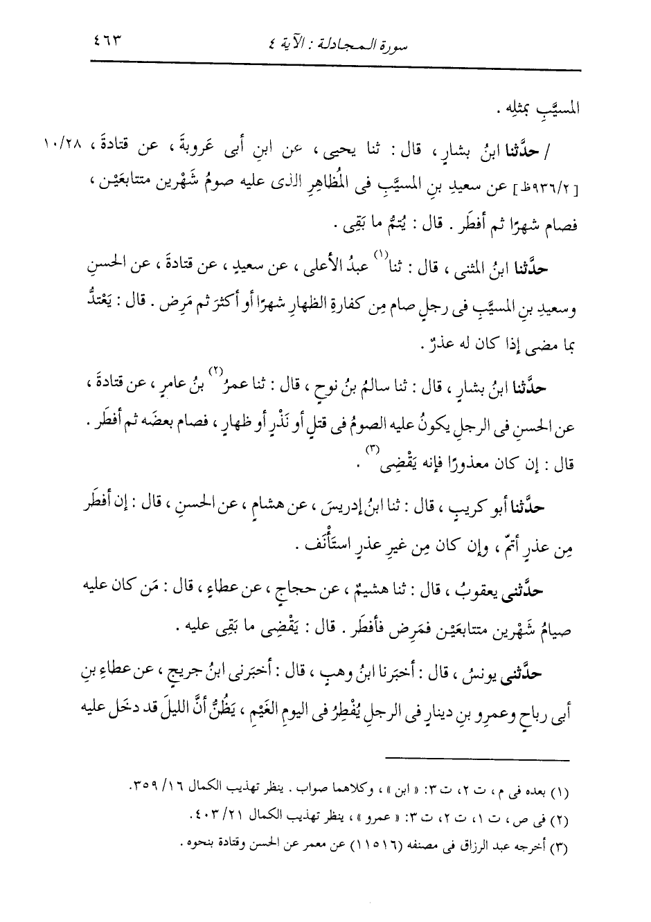 حَدَّثَنَا ابْنُ بَشَّارٍ، قَالَ: ثنا يَحْيَى، عَنِ ابْنِ أَبِي عَرُوبَةَ، عَنْ قَتَادَةَ، عَنْ سَعِيدِ بْنِ الْمُسَيِّبِ، فِي §الْمُظَاهِرِ الَّذِي عَلَيْهِ صَوْمُ شَهْرَيْنِ مُتَتَابِعَيْنِ، فَصَامَ شَهْرًا، ثُمَّ أَفْطَرَ، قَالَ: يُتِمُّ مَا بَقِيَ
