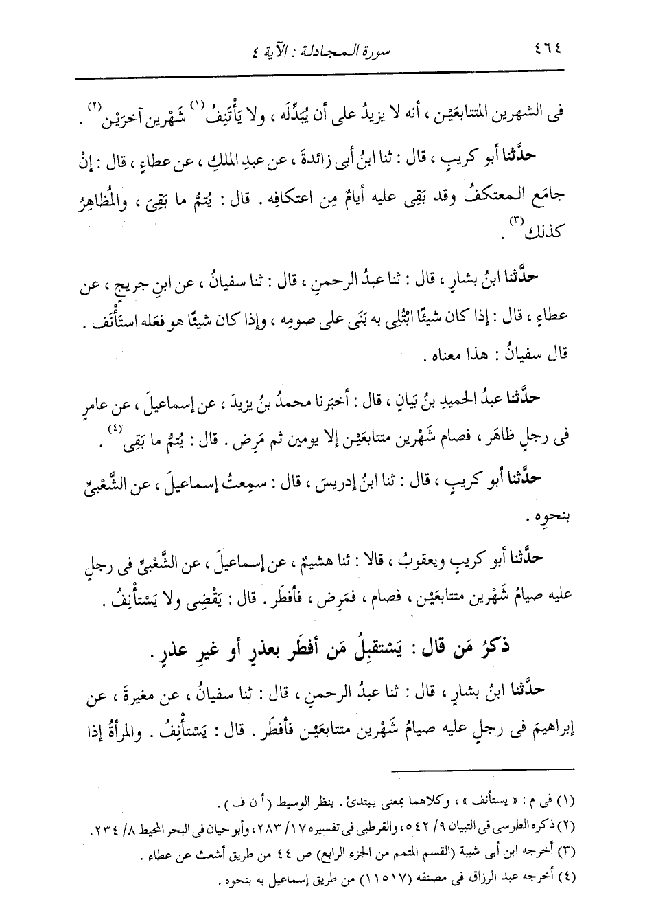 ذَكْرُ مَنْ قَالَ: يَسْتَقْبِلُ مَنْ أَفْطَرَ بِعُذْرٍ أَوْ غَيْرِ عُذْرٍ حَدَّثَنَا ابْنُ بَشَّارٍ، قَالَ: ثنا عَبْدُ الرَّحْمَنِ، قَالَ: ثنا سُفْيَانُ، عَنْ مُغِيرَةَ، عَنْ إِبْرَاهِيمَ، فِي رَجُلٍ §عَلَيْهِ صِيَامُ شَهْرَيْنِ مُتَتَابِعَيْنِ فَأَفْطَرَ، قَالَ: يَسْتَأْنِفُ، وَالْمَرْأَةُ إِذَا -[465]- حَاضَتْ فَأَفْطَرَتْ تَقْضِي