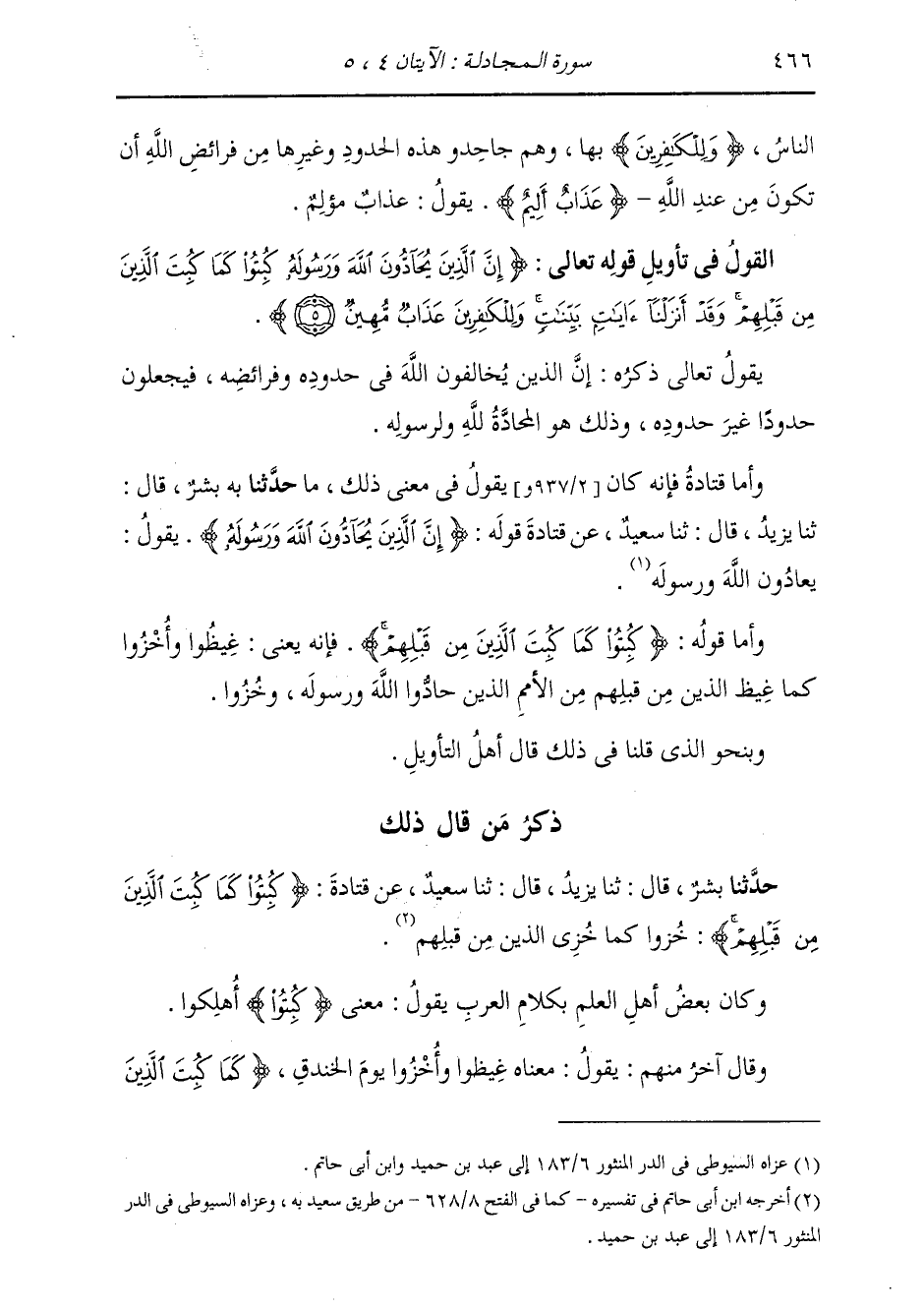 §الْقَوْلُ فِي تَأْوِيلِ قَوْلِهِ تَعَالَى: {إِنَّ الَّذِينَ يُحَادُّونَ اللَّهَ وَرَسُولَهُ كُبِتُوا كَمَا كُبِتَ الَّذِينَ مِنْ قَبْلِهِمْ وَقَدْ أَنْزَلْنَا آيَاتٍ بَيِّنَاتٍ وَلِلْكَافِرِينَ عَذَابٌ مُهِينٌ} [المجادلة: 5] يَقُولُ تَعَالَى ذِكْرُهُ: إِنَّ الَّذِينَ يُخَالِفُونَ اللَّهَ فِي حُدُودِهِ وَفَرَائِضِهِ، فَيَجْعَلُونَ حُدُودًا غَيْرَ حُدُودِهِ، وَذَلِكَ هُوَ الْمُحَادَّةُ لِلَّهِ وَلِرَسُولِهِ، وَأَمَّا قَتَادَةُ فَإِنَّهُ كَانَ يَقُولُ فِي مَعْنَى ذَلِكَ مَا: