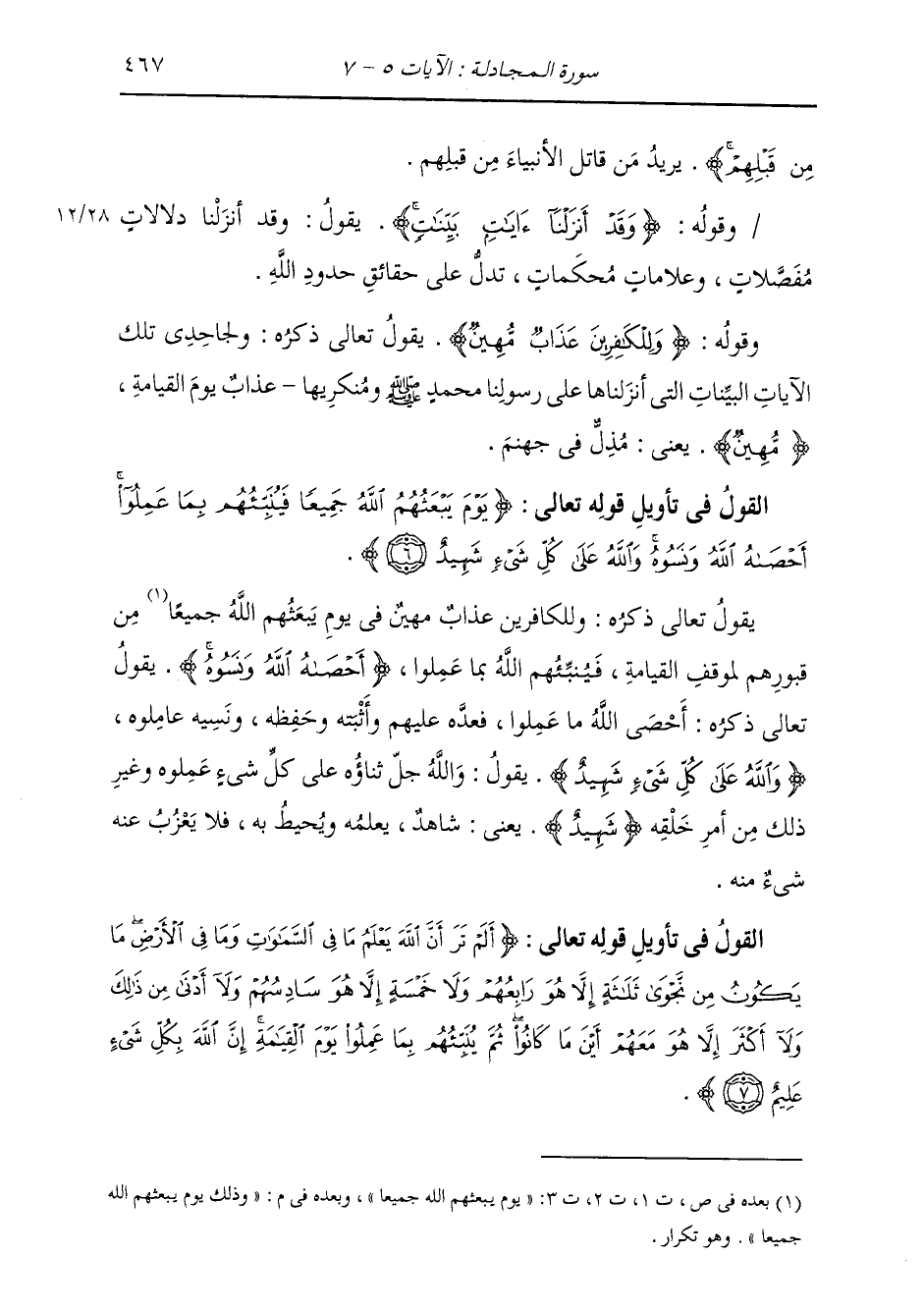 §الْقَوْلُ فِي تَأْوِيلِ قَوْلِهِ تَعَالَى: {يَوْمَ يَبْعَثُهُمُ اللَّهُ جَمِيعًا فَيُنَبِّئُهُمْ بِمَا عَمِلُوا أَحْصَاهُ اللَّهُ وَنَسُوهُ وَاللَّهُ عَلَى كُلِّ شَيْءٍ شَهِيدٌ} [المجادلة: 6] يَقُولُ تَعَالَى ذِكْرُهُ: وَلِلْكَافِرِينَ عَذَابٌ مُهِينٌ فِي يَوْمِ يَبْعَثُهُمُ اللَّهُ جَمِيعًا، وَذَلِكَ يَوْمَ يَبْعَثُهُمُ اللَّهُ جَمِيعًا مِنْ قُبُورِهِمْ لِمَوْقِفِ الْقِيَامَةِ {فَيُنَبِّئُهُمُ} [الأنعام: 108] اللَّهُ {بِمَا عَمِلُوا أَحْصَاهُ اللَّهُ وَنَسُوهُ} [المجادلة: 6] يَقُولُ تَعَالَى ذِكْرُهُ: أَحْصَى اللَّهُ مَا عَمِلُوا، فَعَدَّهُ عَلَيْهِمْ، وَأَثْبَتَهُ وَحَفِظَهُ، وَنَسِيَهُ عَامِلُوهُ {وَاللَّهُ عَلَى كُلِّ شَيْءٍ شَهِيدٌ} [المجادلة: 6] يَقُولُ: وَاللَّهُ جَلَّ ثَنَاؤُهُ عَلَى كُلِّ شَيْءٍ عَمِلُوهُ وَغَيْرِ ذَلِكَ مِنْ أَمْرِ خَلْقِهِ {شَهِيدٌ} [البقرة: 282] يَعْنِي شَاهِدٌ يَعْلَمُهُ وَيُحِيطُ بِهِ، فَلَا يَغْرُبُ عَنْهُ شَيْءٌ مِنْهُ.