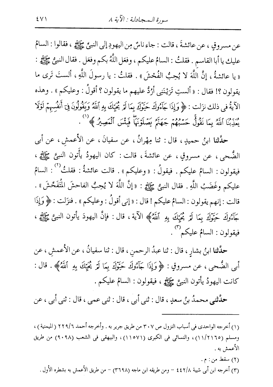 حَدَّثَنَا ابْنُ حُمَيْدٍ، قَالَ: ثنا مِهْرَانُ، عَنْ سُفْيَانَ، عَنِ الْأَعْمَشِ، عَنْ أَبِي الضُّحَى، عَنْ مَسْرُوقٍ، عَنْ عَائِشَةَ، قَالَتْ: كَانَ الْيَهُودُ يَأْتُونَ النَّبِيَّ صَلَّى اللهُ عَلَيْهِ وَسَلَّمَ فَيَقُولُونَ: السَّامُ عَلَيْكُمْ، فَيَقُولُ: «عَلَيْكُمْ» . قَالَتْ عَائِشَةُ: السَّامُ عَلَيْكُمْ وَغَضَبُ اللَّهِ. فَقَالَ النَّبِيُّ صَلَّى اللهُ عَلَيْهِ وَسَلَّمَ: «إِنَّ §اللَّهَ لَا يُحِبُّ الْفَاحِشَ الْمُتَفَحِّشَ» . قَالَتْ: إِنَّهُمْ يَقُولُونَ: السَّامُ عَلَيْكُمْ، قَالَ: " إِنِّي أَقُولُ: عَلَيْكُمْ ". فَنَزَلَتْ: {وَإِذَا جَاءُوكَ حَيَّوْكَ بِمَا لَمْ يُحَيِّكَ بِهِ اللَّهُ} قَالَ: فَإِنَّ الْيَهُودَ يَأْتُونَ النَّبِيَّ صَلَّى اللهُ عَلَيْهِ وَسَلَّمَ، فَيَقُولُونَ: السَّامُ عَلَيْكُمْ