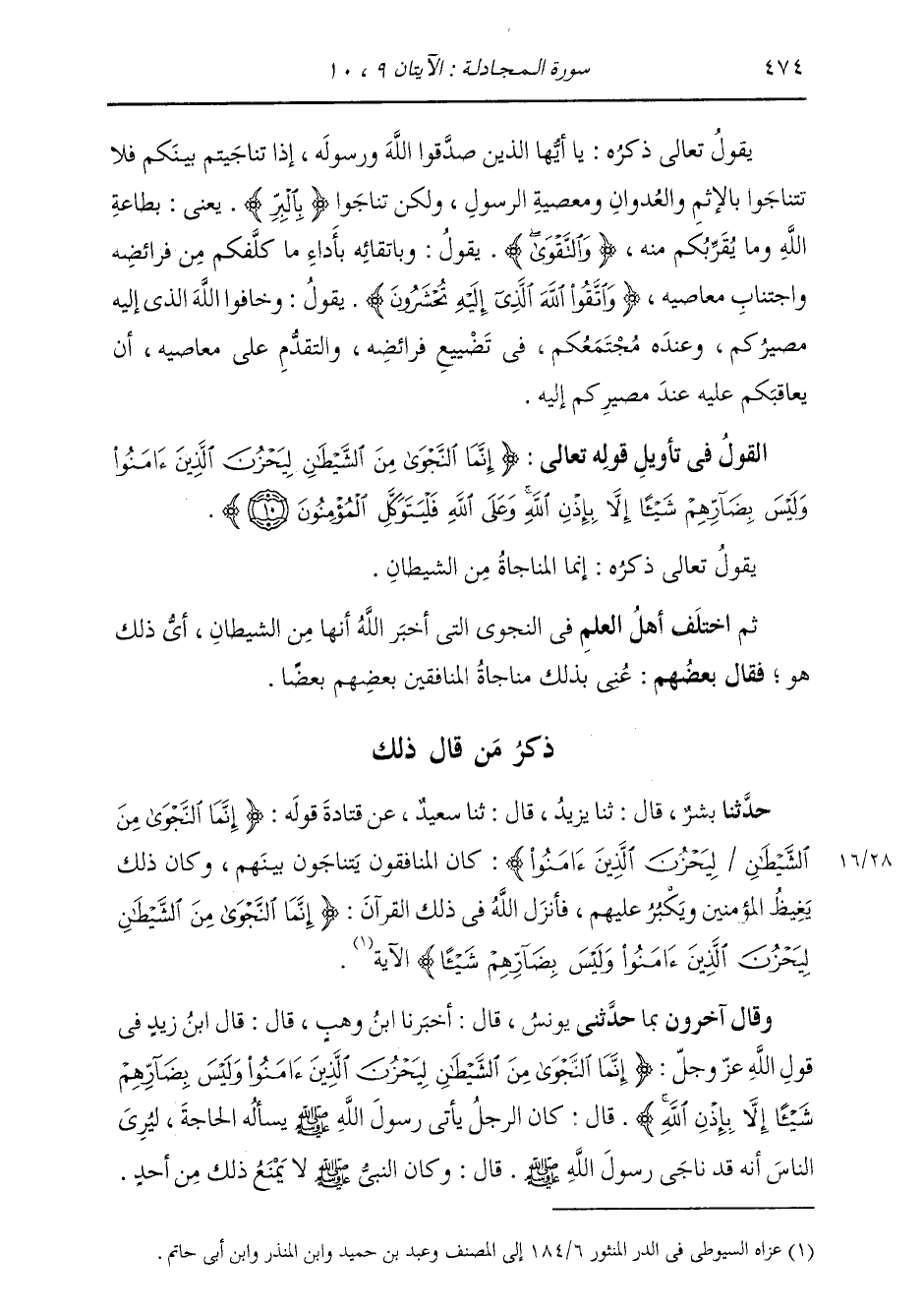§الْقَوْلُ فِي تَأْوِيلِ قَوْلِهِ تَعَالَى: {إِنَّمَا النَّجْوَى مِنَ الشَّيْطَانِ لِيَحْزُنَ الَّذِينَ آمَنُوا وَلَيْسَ بِضَارِّهِمْ شَيْئًا إِلَّا بِإِذْنِ اللَّهِ وَعَلَى اللَّهِ فَلْيَتَوَكَّلِ الْمُؤْمِنُونَ} [المجادلة: 10] يَقُولُ تَعَالَى ذِكْرُهُ: إِنَّمَا الْمُنَاجَاةُ مِنَ الشَّيْطَانِ، ثُمَّ اخْتَلَفَ أَهْلُ الْعِلْمِ فِي النَّجْوَى الَّتِي أَخْبَرَ اللَّهُ أَنَّهَا مِنَ الشَّيْطَانِ، أَيُّ ذَلِكَ هُوَ، فَقَالَ بَعْضُهُمْ: عَنَى بِذَلِكَ مُنَاجَاةَ الْمُنَافِقِينَ بَعْضُهُمْ بَعْضًا.