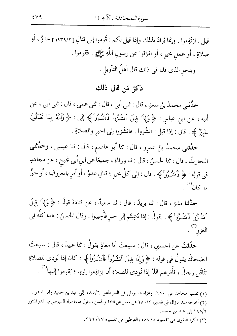 حَدَّثَنِي مُحَمَّدُ بْنُ عَمْرٍو، قَالَ: ثنا أَبُو عَاصِمٍ، قَالَ: ثنا عِيسَى، وَحَدَّثَنِي الْحَارِثُ، قَالَ: ثنا الْحَسَنُ، قَالَ: ثنا وَرْقَاءُ، جَمِيعًا عَنِ ابْنِ أَبِي نَجِيحٍ، عَنْ مُجَاهِدٍ، فِي قَوْلِهِ: {§فَانْشُزُوا} [المجادلة: 11] قَالَ: إِلَى كُلِّ خَيْرٍ، قِتَالِ عَدُوٍّ، أَوْ أَمْرٍ بِالْمَعْرُوفِ، أَوْ حَقٍّ مَا كَانَ