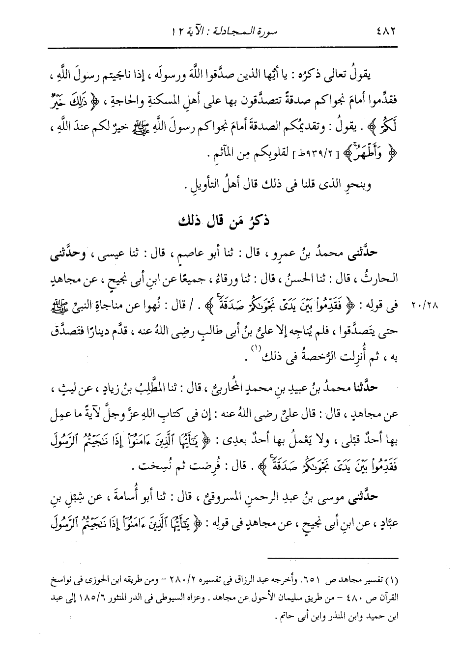 حَدَّثَنِي مُوسَى بْنُ عَبْدِ الرَّحْمَنِ الْمَسْرُوقِيُّ، قَالَ: ثنا أَبُو أُسَامَةَ، عَنْ شِبْلِ بْنِ عَبَّادٍ، عَنِ ابْنِ أَبِي نَجِيحٍ، عَنْ مُجَاهِدٍ، فِي قَوْلِهِ: {§يَا أَيُّهَا الَّذِينَ آمَنُوا إِذَا نَاجَيْتُمُ الرَّسُولَ -[483]- فَقَدِّمُوا بَيْنَ يَدَيْ نَجْوَاكُمْ صَدَقَةً} [المجادلة: 12] قَالَ: نُهُوا عَنْ مُنَاجَاةِ النَّبِيِّ صَلَّى اللهُ عَلَيْهِ وَسَلَّمَ حَتَّى يَتَصَدَّقُوا، فَلَمْ يُنَاجِهِ إِلَّا عَلِيُّ بْنُ أَبِي طَالِبٍ رَضِيَ اللَّهُ عَنْهُ قَدَّمَ دِينَارًا صَدَقَةً تَصَدَّقَ بِهِ، ثُمَّ أُنْزِلَتِ الرُّخْصَةُ