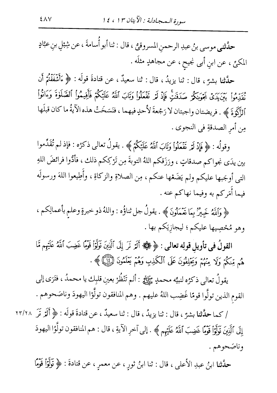 كَمَا: حَدَّثَنَا بِشْرٌ، قَالَ: ثنا يَزِيدُ، قَالَ: ثنا سَعِيدٌ، عَنْ قَتَادَةَ، قَوْلُهُ: {§أَلَمْ تَرَ إِلَى الَّذِينَ تَوَلَّوْا قَوْمًا غَضِبَ اللَّهُ عَلَيْهِمْ} [المجادلة: 14] إِلَى آخِرِ الْآيَةِ، قَالَ: هُمُ الْمُنَافِقُونَ تَوَلَّوُا الْيَهُودَ وَنَاصَحُوهُمْ