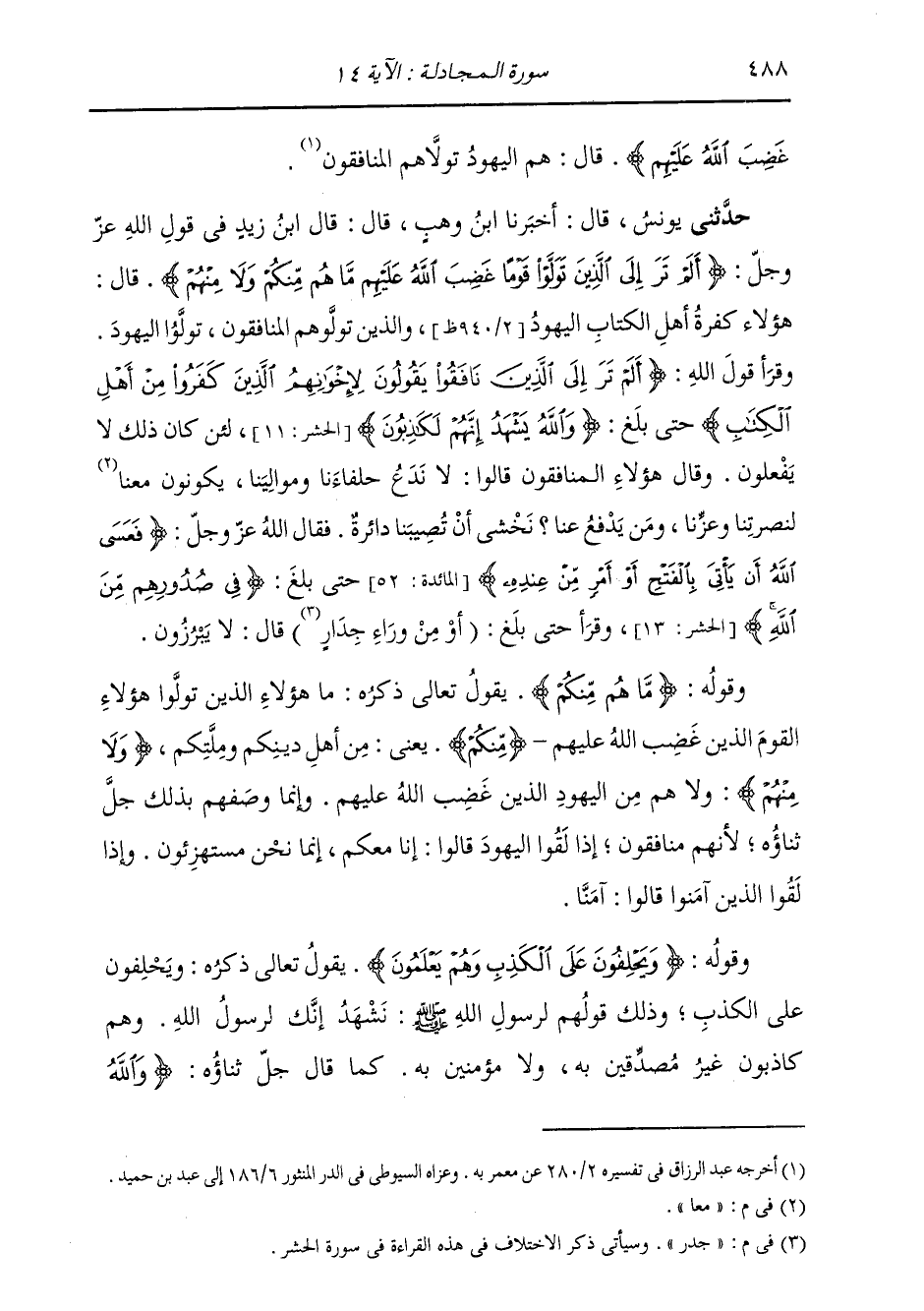 حَدَّثَنِي يُونُسُ، قَالَ: أَخْبَرَنَا ابْنُ وَهْبٍ، قَالَ: قَالَ ابْنُ زَيْدٍ، فِي قَوْلِ اللَّهِ عَزَّ وَجَلَّ {§أَلَمْ تَرَ إِلَى الَّذِينَ تَوَلَّوْا قَوْمًا غَضِبَ اللَّهُ عَلَيْهِمْ مَا هُمْ مِنْكُمْ وَلَا مِنْهُمْ} [المجادلة: 14] قَالَ: هَؤُلَاءِ كَفَرَةُ أَهْلِ الْكِتَابِ الْيَهُودُ وَالَّذِينَ تَوَلَّوْهُمُ الْمُنَافِقُونَ تَوَلَّوُا الْيَهُودَ، وَقَرَأَ قَوْلَ اللَّهِ: {أَلَمْ تَرَ إِلَى الَّذِينَ نَافَقُوا يَقُولُونَ لِإِخْوَانِهِمُ الَّذِينَ كَفَرُوا مِنْ أَهْلِ الْكِتَابِ} [الحشر: 11] حَتَّى بَلَغَ {وَاللَّهُ يَشْهَدُ إِنَّهُمْ لَكَاذِبُونَ} [التوبة: 107] لَئِنْ كَانَ ذَلِكَ لَا يَفْعَلُونَ وَقَالَ: هَؤُلَاءِ الْمُنَافِقُونَ قَالُوا: لَا نَدَعُ حُلَفَاءَنَا وَمَوَالِينَا يَكُونُوا مَعًا لَنُصْرَتِنَا وَعِزِّنَا، وَمَنْ يَدْفَعُ عَنَّا نَخْشَى أَنْ تُصِيبَنَا دَائِرَةٌ، فَقَالَ اللَّهُ عَزَّ وَجَلَّ: {فَعَسَى اللَّهُ أَنْ يَأْتِيَ بِالْفَتْحِ أَوْ أَمْرٍ مِنْ عِنْدِهِ} [المائدة: 52] حَتَّى بَلَغَ: {فِي صُدُورِهِمْ مِنَ اللَّهِ} [الحشر: 13] وَقَرَأَ حَتَّى بَلَغَ: {أَوْ مِنْ وَرَاءِ جُدُرٍ} [الحشر: 14] قَالَ: لَا يَبْرُزُونَ