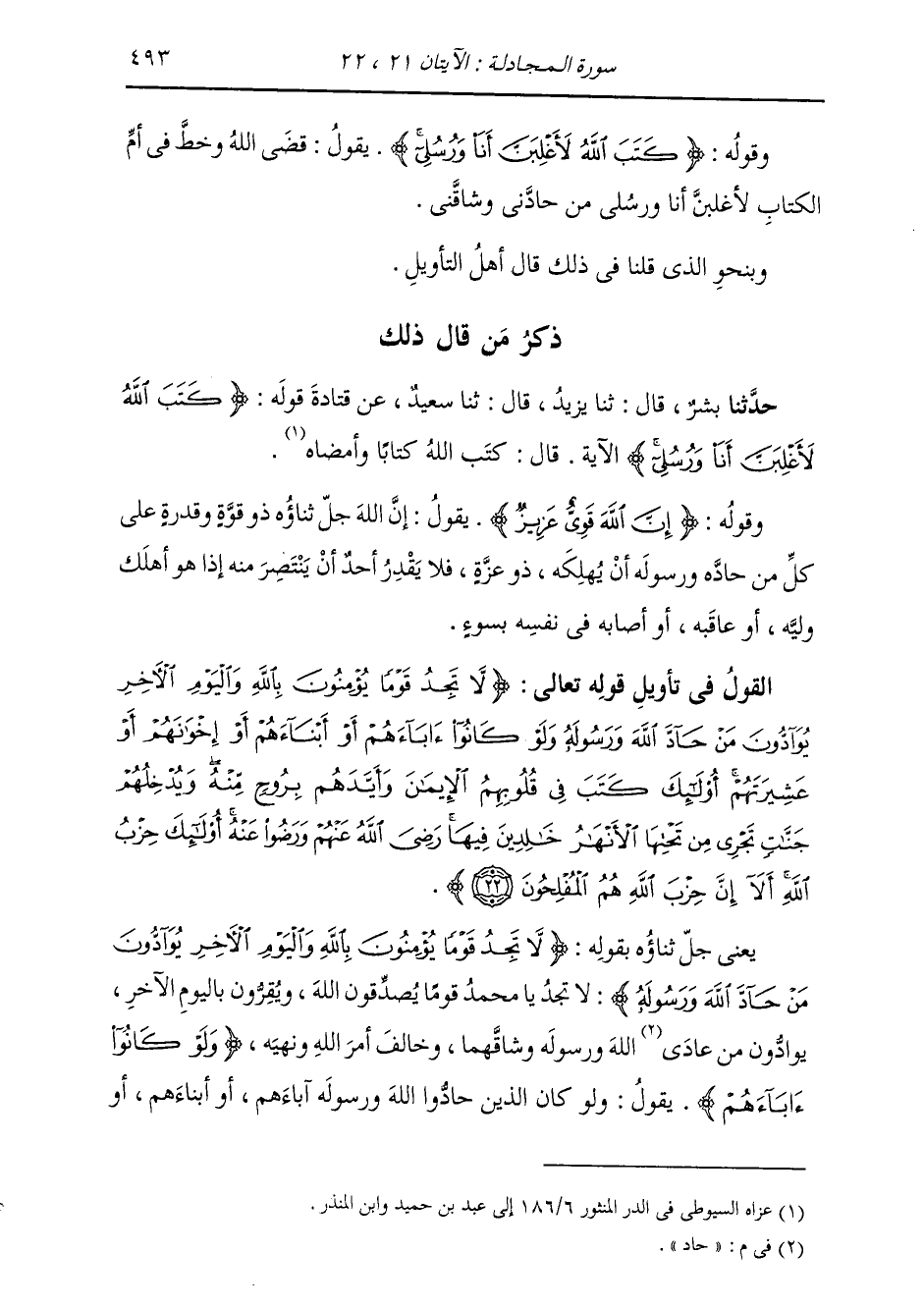 §وَقَوْلُهُ: {كَتَبَ اللَّهُ لَأُغْلَبَنَّ أَنَا وَرُسُلِي} [المجادلة: 21] يَقُولُ: قَضَى اللَّهُ وَخَطَّ فِي أُمِّ الْكِتَابِ، لَأَغْلِبَنَّ أَنَا وَرُسُلِي مَنْ حَادَّنِي وَشَاقَّنِي. وَبِنَحْوِ الَّذِي قُلْنَا فِي ذَلِكَ قَالَ أَهْلُ التَّأْوِيلِ.