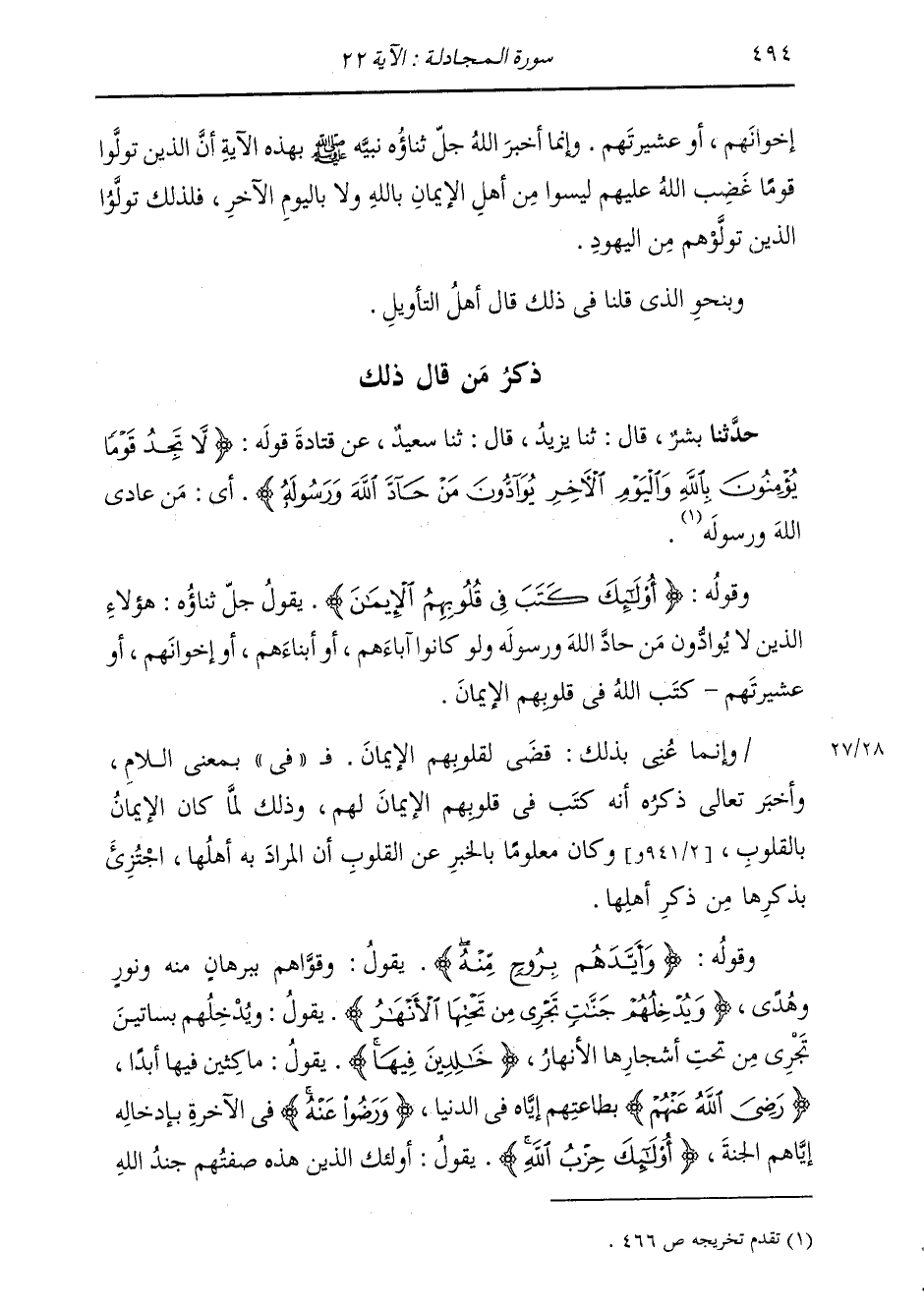 §وَقَوْلُهُ: {أُولَئِكَ كَتَبَ فِي قُلُوبِهِمُ الْإِيمَانَ} [المجادلة: 22] يَقُولُ جَلَّ ثَنَاؤُهُ: هَؤُلَاءِ الَّذِينَ لَا يُوَادُّونَ مَنْ حَادَّ اللَّهَ وَرَسُولَهُ وَلَوْ كَانُوا آبَاءَهُمْ، أَوْ أَبْنَاءَهُمْ، أَوْ إِخْوَانَهُمْ، أَوْ عَشِيرَتَهُمْ، كَتَبَ اللَّهُ فِي قُلُوبِهِمُ الْإِيمَانَ، وَإِنَّمَا عُنِيَ بِذَلِكَ: قَضَى لِقُلُوبِهِمُ الْإِيمَانَ. فَـ «فِي» بِمَعْنَى اللَّامِ، وَأَخْبَرَ تَعَالَى ذِكْرُهُ أَنَّهُ كَتَبَ فِي قُلُوبِهِمُ الْإِيمَانَ لَهُمْ، وَذَلِكَ لَمَّا كَانَ الْإِيمَانُ بِالْقُلُوبِ، وَكَانَ مَعْلُومًا بِالْخَبَرِ عَنِ الْقُلُوبِ أَنَّ الْمُرَادَ بِهِ أَهْلُهَا، اجْتَزَى بِذِكْرِهَا مِنْ ذِكْرِ أَهْلِهَا.